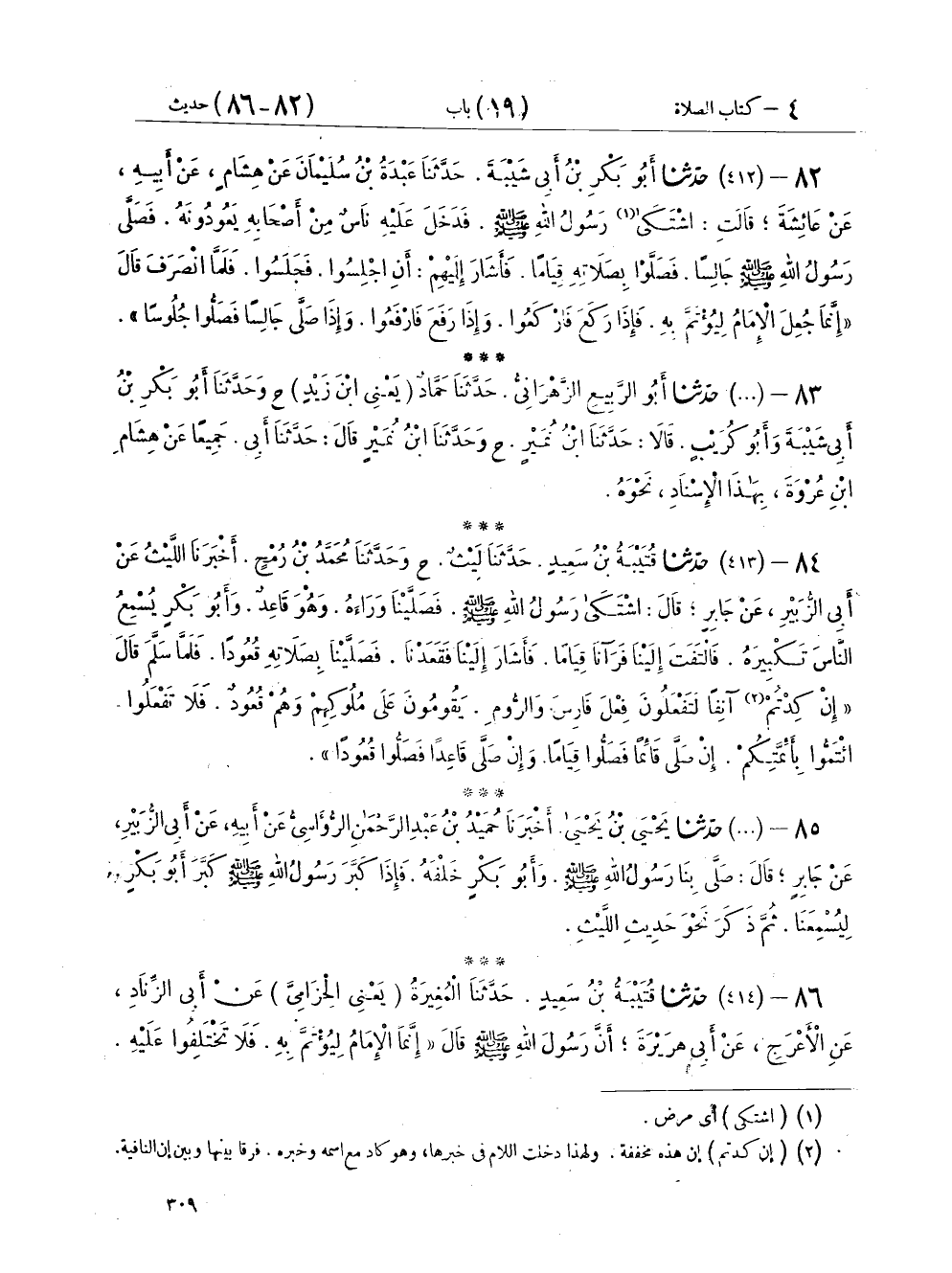 ٨٤ - (٤١٣) حَدَّثَنَا قُتَيْبَةُ بْنُ سَعِيدٍ، حَدَّثَنَا لَيْثٌ، ح وَحَدَّثَنَا مُحَمَّدُ بْنُ رُمْحٍ، أَخْبَرَنَا اللَّيْثُ، عَنْ أَبِي الزُّبَيْرِ، عَنْ جَابِرٍ، قَالَ: اشْتَكَى رَسُولُ اللهِ صَلَّى اللهُ عَلَيْهِ وَسَلَّمَ فَصَلَّيْنَا وَرَاءَهُ وَهُوَ قَاعِدٌ، وَأَبُو بَكْرٍ يُسْمِعُ النَّاسَ تَكْبِيرَهُ، فَالْتَفَتَ إِلَيْنَا فَرَآنَا قِيَامًا، فَأَشَارَ إِلَيْنَا فَقَعَدْنَا فَصَلَّيْنَا بِصَلَاتِهِ قُعُودًا فَلَمَّا سَلَّمَ قَالَ: «إِنْ كِدْتُمْ آنِفًا لَتَفْعَلُونَ فِعْلَ فَارِسَ وَالرُّومِ يَقُومُونَ عَلَى مُلُوكِهِمْ، وَهُمْ قُعُودٌ فَلَا تَفْعَلُوا ائْتَمُّوا بِأَئِمَّتِكُمْ إِنْ صَلَّى قَائِمًا فَصَلُّوا قِيَامًا وَإِنْ صَلَّى قَاعِدًا فَصَلُّوا قُعُودًا»
