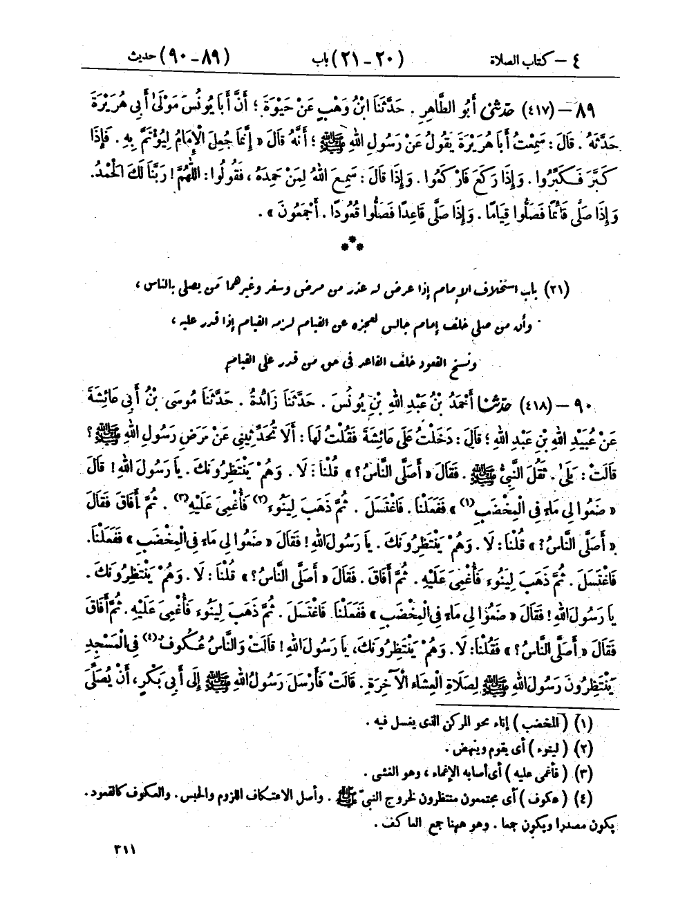 ٩٠ - (٤١٨) حَدَّثَنَا أَحْمَدُ بْنُ عَبْدِ اللهِ بْنِ يُونُسَ، حَدَّثَنَا زَائِدَةُ، حَدَّثَنَا مُوسَى بْنُ أَبِي عَائِشَةَ، عَنْ عُبَيْدِ اللهِ بْنِ عَبْدِ اللهِ، قَالَ: دَخَلْتُ عَلَى عَائِشَةَ فَقُلْتُ لَهَا أَلَا تُحَدِّثِينِي عَنْ مَرَضِ رَسُولِ اللهِ صَلَّى اللهُ عَلَيْهِ وَسَلَّمَ؟ قَالَتْ: بَلَى ثَقُلَ النَّبِيُّ صَلَّى اللهُ عَلَيْهِ وَسَلَّمَ فَقَالَ: «أَصَلَّى النَّاسُ؟» قُلْنَا: لَا، وَهُمْ يَنْتَظِرُونَكَ يَا رَسُولَ اللهِ قَالَ: «ضَعُوا لِي مَاءً فِي الْمِخْضَبِ» فَفَعَلْنَا فَاغْتَسَلَ ثُمَّ ذَهَبَ لِيَنُوءَ فَأُغْمِيَ عَلَيْهِ ثُمَّ أَفَاقَ فَقَالَ: «أَصَلَّى النَّاسُ؟» قُلْنَا لَا، وَهُمْ يَنْتَظِرُونَكَ يَا رَسُولَ اللهِ فَقَالَ: «ضَعُوا لِي مَاءً فِي الْمِخْضَبِ» فَفَعَلْنَا فَاغْتَسَلَ، ثُمَّ ذَهَبَ لِيَنُوءَ فَأُغْمِيَ عَلَيْهِ ثُمَّ أَفَاقَ، فَقَالَ: «أَصَلَّى النَّاسُ؟» قُلْنَا لَا، وَهُمْ يَنْتَظِرُونَكَ يَا رَسُولَ اللهِ، فَقَالَ: «ضَعُوا لِي مَاءً فِي الْمِخْضَبِ» فَفَعَلْنَا فَاغْتَسَلَ ثُمَّ ذَهَبَ لِيَنُوءَ فَأُغْمِيَ عَلَيْهِ، ثُمَّ أَفَاقَ فَقَالَ: «أَصَلَّى النَّاسُ؟» فَقُلْنَا لَا، وَهُمْ يَنْتَظِرُونَكَ يَا رَسُولَ اللهِ، قَالَتْ: وَالنَّاسُ عُكُوفٌ فِي الْمَسْجِدِ يَنْتَظِرُونَ رَسُولَ اللهِ صَلَّى اللهُ عَلَيْهِ وَسَلَّمَ لِصَلَاةِ الْعِشَاءِ الْآخِرَةِ، قَالَتْ: فَأَرْسَلَ رَسُولُ اللهِ صَلَّى اللهُ عَلَيْهِ وَسَلَّمَ إِلَى أَبِي بَكْرٍ أَنْ يُصَلِّيَ بِالنَّاسِ، فَأَتَاهُ الرَّسُولُ فَقَالَ: إِنَّ رَسُولَ اللهِ صَلَّى اللهُ عَلَيْهِ وَسَلَّمَ يَأْمُرُكَ أَنْ تُصَلِّيَ بِالنَّاسِ، فَقَالَ أَبُو بَكْرٍ وَكَانَ رَجُلًا رَقِيقًا يَا عُمَرُ صَلِّ بِالنَّاسِ، قَالَ: فَقَالَ عُمَرُ: أَنْتَ أَحَقُّ بِذَلِكَ، قَالَتْ: فَصَلَّى بِهِمْ أَبُو بَكْرٍ تِلْكَ الْأَيَّامَ، ثُمَّ إِنَّ رَسُولَ اللهِ صَلَّى اللهُ عَلَيْهِ وَسَلَّمَ وَجَدَ مِنْ نَفْسِهِ خِفَّةً فَخَرَجَ بَيْنَ رَجُلَيْنِ أَحَدُهُمَا الْعَبَّاسُ، لِصَلَاةِ الظُّهْرِ وَأَبُو بَكْرٍ يُصَلِّي بِالنَّاسِ فَلَمَّا رَآهُ أَبُو بَكْرٍ ذَهَبَ لِيَتَأَخَّرَ فَأَوْمَأَ إِلَيْهِ النَّبِيُّ صَلَّى اللهُ عَلَيْهِ وَسَلَّمَ أَنْ لَا يَتَأَخَّرَ وَقَالَ لَهُمَا: «أَجْلِسَانِي إِلَى جَنْبِهِ» فَأَجْلَسَاهُ إِلَى جَنْبِ أَبِي بَكْرٍ، وَكَانَ أَبُو بَكْرٍ يُصَلِّي وَهُوَ قَائِمٌ بِصَلَاةِ النَّبِيِّ صَلَّى اللهُ عَلَيْهِ وَسَلَّمَ وَالنَّاسُ يُصَلُّونَ بِصَلَاةِ أَبِي بَكْرٍ، وَالنَّبِيُّ صَلَّى اللهُ عَلَيْهِ وَسَلَّمَ قَاعِدٌ قَالَ عُبَيْدُ اللهِ: فَدَخَلْتُ عَلَى عَبْدِ اللهِ بْنِ عَبَّاسٍ فَقُلْتُ لَهُ: أَلَا أَعْرِضُ عَلَيْكَ مَا حَدَّثَتْنِي عَائِشَةُ عَنْ مَرَضِ رَسُولِ اللهِ صَلَّى اللهُ عَلَيْهِ وَسَلَّمَ فَقَالَ: هَاتِ فَعَرَضْتُ حَدِيثَهَا عَلَيْهِ فَمَا أَنْكَرَ مِنْهُ شَيْئًا غَيْرَ أَنَّهُ قَالَ: " أَسَمَّتْ لَكَ الرَّجُلَ الَّذِي كَانَ مَعَ الْعَبَّاسِ قُلْتُ: لَا. قَالَ: هُوَ عَلِيٌّ "