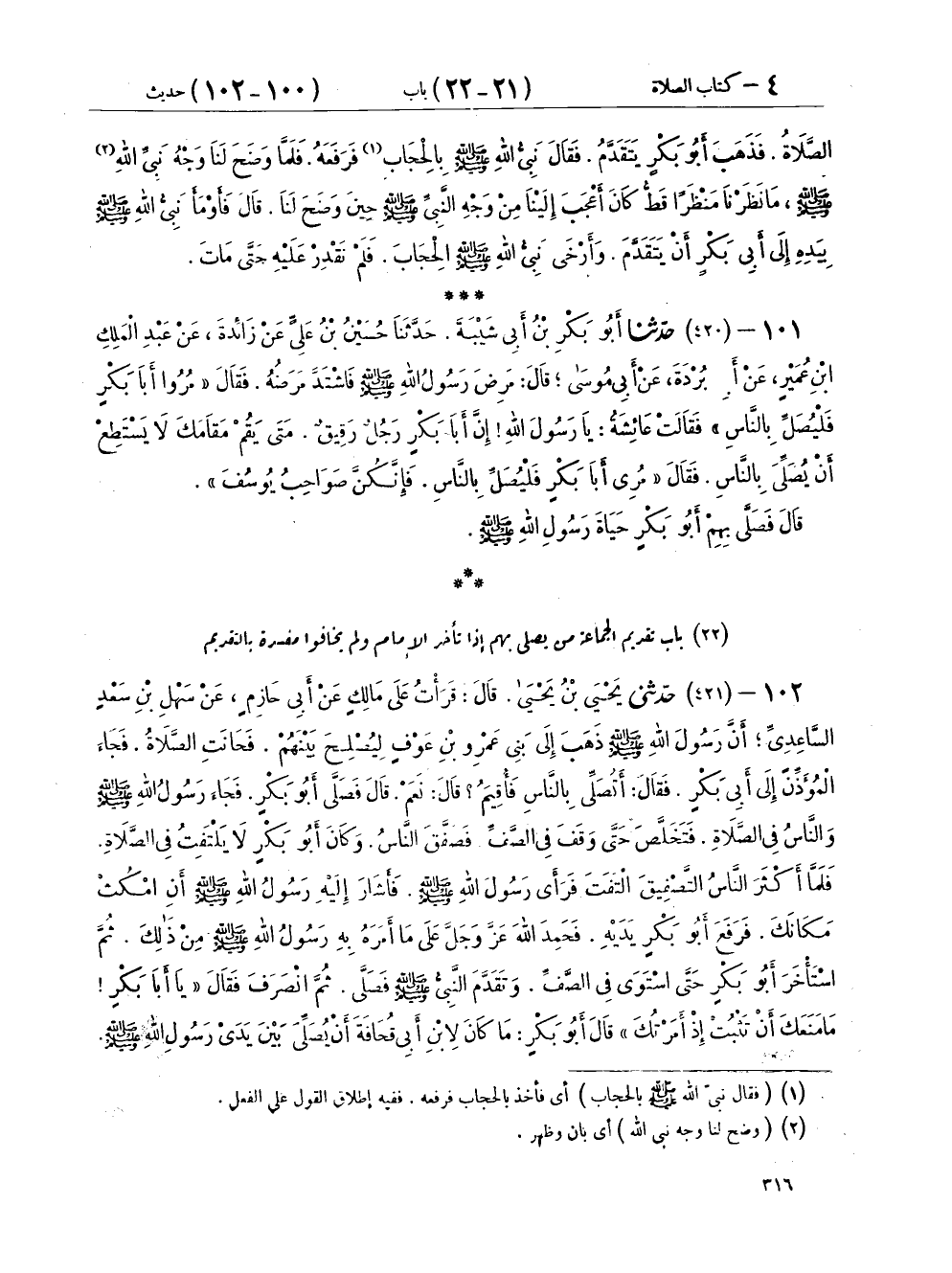 ١٠٢ - (٤٢١) حَدَّثَنِي يَحْيَى بْنُ يَحْيَى، قَالَ: قَرَأْتُ عَلَى مَالِكٍ، عَنْ أَبِي حَازِمٍ، عَنْ سَهْلِ بْنِ سَعْدٍ السَّاعِدِيِّ أَنَّ رَسُولَ اللهِ صَلَّى اللهُ عَلَيْهِ وَسَلَّمَ ذَهَبَ إِلَى بَنِي عَمْرِو بْنِ عَوْفٍ لِيُصْلِحَ بَيْنَهُمْ فَحَانَتِ الصَّلَاةُ فَجَاءَ الْمُؤَذِّنُ إِلَى أَبِي بَكْرٍ فَقَالَ: أَتُصَلِّي بِالنَّاسِ فَأُقِيمُ؟ قَالَ: نَعَمْ، قَالَ فَصَلَّى أَبُو بَكْرٍ فَجَاءَ رَسُولُ اللهِ صَلَّى اللهُ عَلَيْهِ وَسَلَّمَ وَالنَّاسُ فِي الصَّلَاةِ فَتَخَلَّصَ حَتَّى وَقَفَ فِي الصَّفِّ، فَصَفَّقَ النَّاسُ وَكَانَ أَبُو بَكْرٍ لَا يَلْتَفِتُ فِي الصَّلَاةِ، فَلَمَّا أَكْثَرَ النَّاسُ التَّصْفِيقَ الْتَفَتَ فَرَأَى رَسُولَ اللهِ صَلَّى اللهُ عَلَيْهِ وَسَلَّمَ فَأَشَارَ إِلَيْهِ رَسُولُ اللهِ صَلَّى اللهُ عَلَيْهِ وَسَلَّمَ أَنِ امْكُثْ مَكَانَكَ، فَرَفَعَ أَبُو بَكْرٍ يَدَيْهِ فَحَمِدَ اللهَ عَزَّ وَجَلَّ عَلَى مَا أَمَرَهُ بِهِ رَسُولُ اللهِ صَلَّى اللهُ عَلَيْهِ وَسَلَّمَ مِنْ ذَلِكَ، ثُمَّ اسْتَأْخَرَ أَبُو بَكْرٍ حَتَّى اسْتَوَى فِي الصَّفِّ، وَتَقَدَّمَ النَّبِيُّ صَلَّى اللهُ عَلَيْهِ وَسَلَّمَ فَصَلَّى، ثُمَّ انْصَرَفَ فَقَالَ: «يَا أَبَا بَكْرٍ مَا مَنَعَكَ أَنْ تَثْبُتَ إِذْ أَمَرْتُكَ» قَالَ أَبُو بَكْرٍ: مَا كَانَ لِابْنِ أَبِي قُحَافَةَ أَنْ يُصَلِّيَ بَيْنَ يَدَيْ رَسُولِ اللهِ صَلَّى اللهُ عَلَيْهِ وَسَلَّمَ، فَقَالَ رَسُولُ اللهِ صَلَّى اللهُ عَلَيْهِ وَسَلَّمَ: «مَا لِي رَأَيْتُكُمْ أَكْثَرْتُمُ التَّصْفِيقَ؟ مَنْ نَابَهُ شَيْءٌ فِي صَلَاتِهِ فَلْيُسَبِّحْ فَإِنَّهُ إِذَا سَبَّحَ الْتُفِتَ إِلَيْهِ وَإِنَّمَا التَّصْفِيحُ لِلنِّسَاءِ»