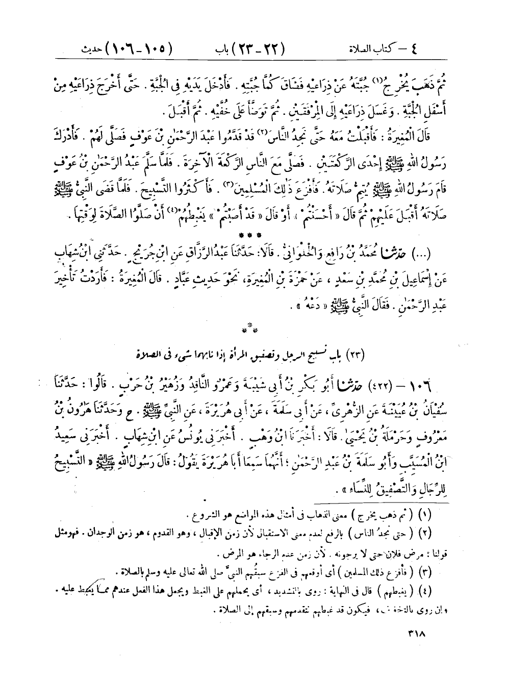 ١٠٦ - (٤٢٢) حَدَّثَنَا أَبُو بَكْرِ بْنُ أَبِي شَيْبَةَ، وَعَمْرٌو النَّاقِدُ، وَزُهَيْرُ بْنُ حَرْبٍ، قَالُوا: حَدَّثَنَا سُفْيَانُ بْنُ عُيَيْنَةَ، عَنِ الزُّهْرِيِّ، ِ عَنْ أَبِي سَلَمَةَ، عَنْ أَبِي هُرَيْرَةَ، عَنِ النَّبِيِّ صَلَّى اللهُ عَلَيْهِ وَسَلَّمَ ح وَحَدَّثَنَا هَارُونُ بْنُ مَعْرُوفٍ، وَحَرْمَلَةُ بْنُ يَحْيَى، قَالَا: أَخْبَرَنَا ابْنُ وَهْبٍ، أَخْبَرَنِي يُونُسُ، عَنِ ابْنِ شِهَابٍ، أَخْبَرَنِي سعيدُ بْنُ الْمُسَيِّبِ، وَأَبُو سَلَمَةَ بْنُ عَبْدِ الرَّحْمَنِ، أَنَّهُمَا سَمِعَا أَبَا هُرَيْرَةَ يَقُولُ: قَالَ رَسُولُ اللهِ صَلَّى اللهُ عَلَيْهِ وَسَلَّمَ: «التَّسْبِيحُ لِلرِّجَالِ وَالتَّصْفِيقُ لِلنِّسَاءِ» زَادَ حَرْمَلَةُ فِي رِوَايَتِهِ: قَالَ ابْنُ شِهَابٍ: وَقَدْ رَأَيْتُ رِجَالًا مِنْ أَهْلِ الْعِلْمِ يُسَبِّحُونَ وَيُشِيرُونَ.