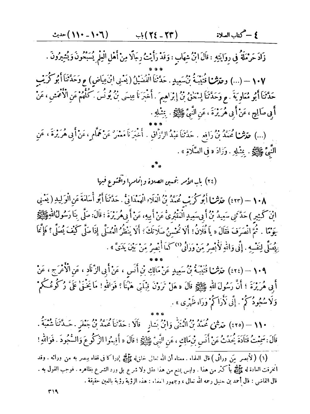 ١٠٩ - (٤٢٤) حَدَّثَنَا قُتَيْبَةُ بْنُ سَعِيدٍ، عَنْ مَالِكِ بْنِ أَنَسٍ، عَنْ أَبِي الزِّنَادِ، عَنِ الْأَعْرَجِ، عَنْ أَبِي هُرَيْرَةَ، أَنَّ رَسُولَ اللهِ صَلَّى اللهُ عَلَيْهِ وَسَلَّمَ قَالَ: «هَلْ تَرَوْنَ قِبْلَتِي هَا هُنَا؟ فَوَاللهِ مَا يَخْفَى عَلَيَّ رُكُوعُكُمْ، وَلَا سُجُودُكُمْ إِنِّي لَأَرَاكُمْ وَرَاءَ ظَهْرِي»