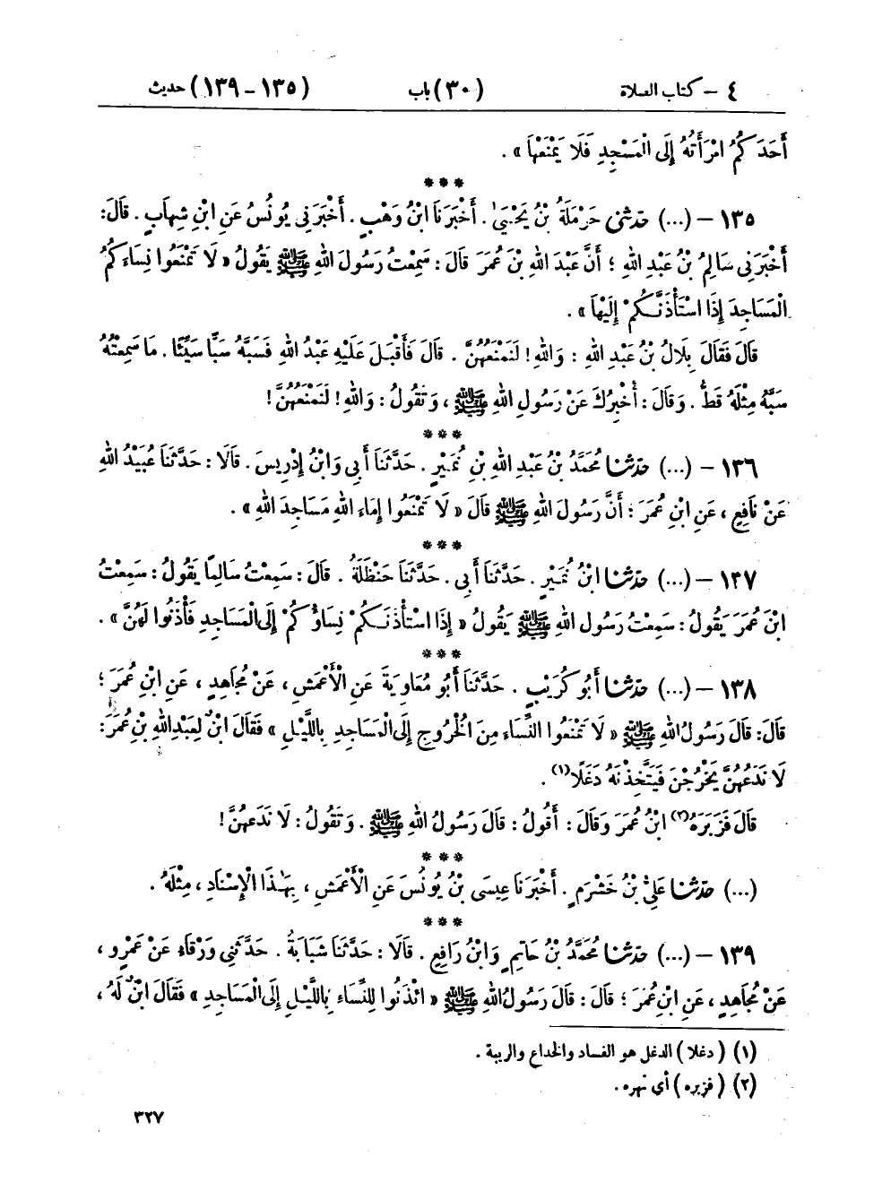 ١٣٥ - (٤٤٢) حَدَّثَنِي حَرْمَلَةُ بْنُ يَحْيَى، أَخْبَرَنَا ابْنُ وَهْبٍ، أَخْبَرَنِي يُونُسُ، عَنِ ابْنِ شِهَابٍ، قَالَ: أَخْبَرَنِي سَالِمُ بْنُ عَبْدِ اللهِ، أَنَّ عَبْدَ اللهِ بْنَ عُمَرَ قَالَ: سَمِعْتُ رَسُولَ اللهِ صَلَّى اللهُ عَلَيْهِ وَسَلَّمَ يَقُولُ: «لَا تَمْنَعُوا نِسَاءَكُمُ الْمَسَاجِدَ إِذَا اسْتَأْذَنَّكُمْ إِلَيْهَا» قَالَ: فَقَالَ بِلَالُ بْنُ عَبْدِ اللهِ: وَاللهِ لَنَمْنَعُهُنَّ، قَالَ: فَأَقْبَلَ عَلَيْهِ عَبْدُ اللهِ: فَسَبَّهُ سَبًّا سَيِّئًا مَا سَمِعْتُهُ سَبَّهُ مِثْلَهُ قَطُّ وَقَالَ: " أُخْبِرُكَ عَنْ رَسُولِ اللهِ صَلَّى اللهُ عَلَيْهِ وَسَلَّمَ وَتَقُولُ: وَاللهِ لَنَمْنَعُهُنَّ "