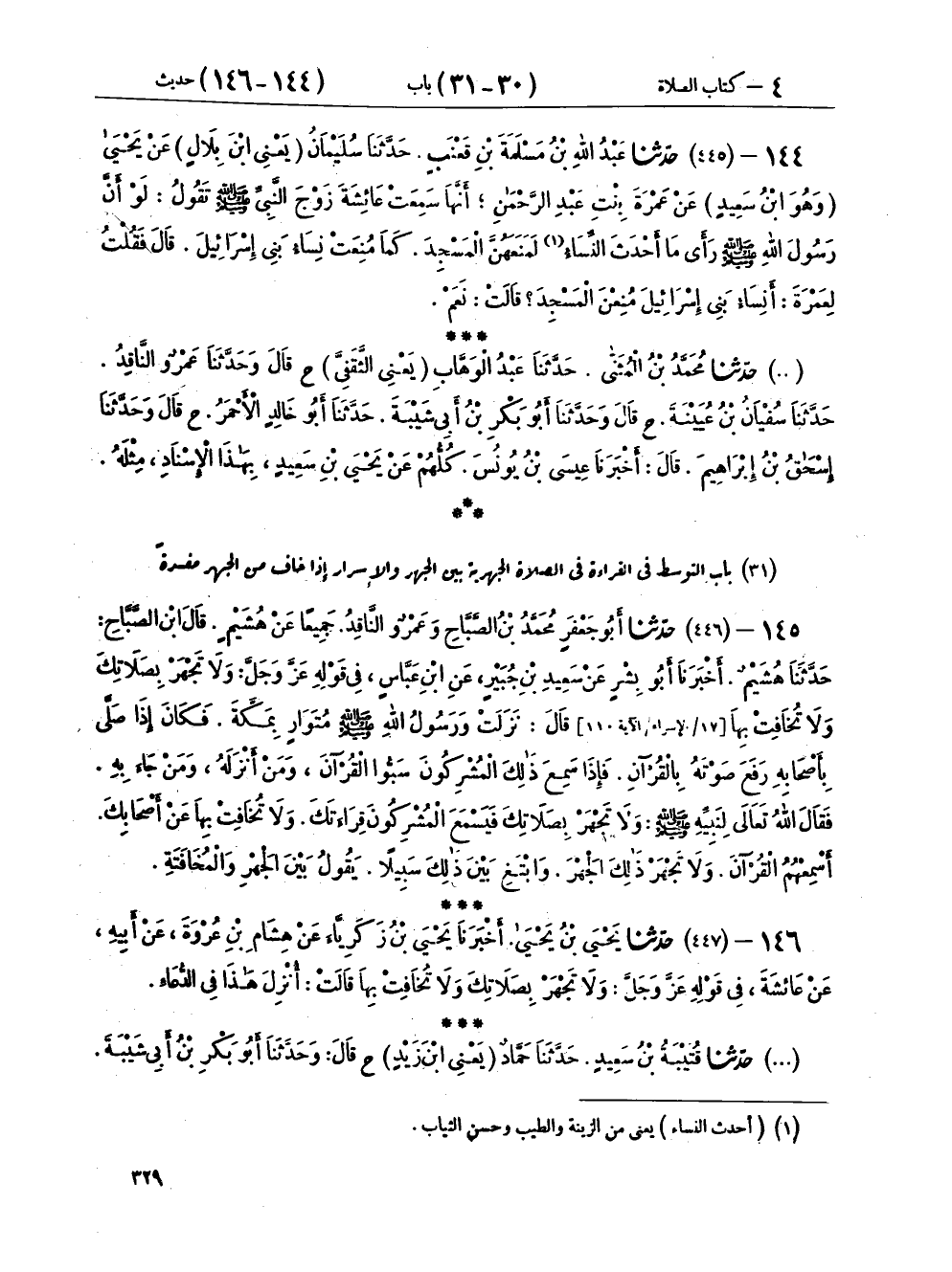 ١٤٦ - (٤٤٧) حَدَّثَنَا يَحْيَى بْنُ يَحْيَى، أَخْبَرَنَا يَحْيَى بْنُ زَكَرِيَّا، عَنْ هِشَامِ بْنِ عُرْوَةَ، عَنْ أَبِيهِ، عَنْ عَائِشَةَ، فِي قَوْلِهِ عَزَّ وَجَلَّ: {وَلَا تَجْهَرْ بِصَلَاتِكَ وَلَا تُخَافِتْ بِهَا} [الإسراء: ١١٠] قَالَتْ: أُنْزِلَ هَذَا فِي الدُّعَاءِ