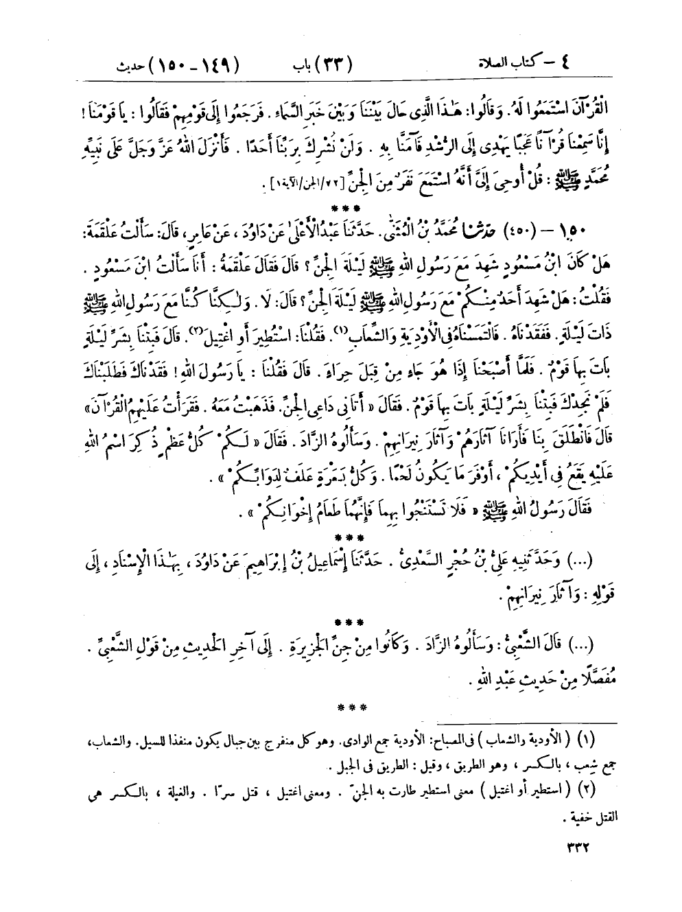 ١٥٠ - (٤٥٠) حَدَّثَنَا مُحَمَّدُ بْنُ الْمُثَنَّى، حَدَّثَنَا عَبْدُ الْأَعْلَى عَنْ دَاوُدَ، عَنْ عَامِرٍ، قَالَ: سَأَلْتُ عَلْقَمَةَ هَلْ كَانَ ابْنُ مَسْعُودٍ شَهِدَ مَعَ رَسُولِ اللهِ صَلَّى اللهُ عَلَيْهِ وَسَلَّمَ لَيْلَةَ الْجِنِّ؟ قَالَ: فَقَالَ عَلْقَمَةُ، أَنَا سَأَلْتُ ابْنَ مَسْعُودٍ فَقُلْتُ: هَلْ شَهِدَ أَحَدٌ مِنْكُمْ مَعَ رَسُولِ اللهِ صَلَّى اللهُ عَلَيْهِ وَسَلَّمَ لَيْلَةَ الْجِنِّ؟ قَالَ: لَا وَلَكِنَّا كُنَّا مَعَ رَسُولِ اللهِ ذَاتَ لَيْلَةٍ فَفَقَدْنَاهُ فَالْتَمَسْنَاهُ فِي الْأَوْدِيَةِ وَالشِّعَابِ. فَقُلْنَا: اسْتُطِيرَ أَوِ اغْتِيلَ. قَالَ: فَبِتْنَا بِشَرِّ لَيْلَةٍ بَاتَ بِهَا قَوْمٌ فَلَمَّا أَصْبَحْنَا إِذَا هُوَ جَاءٍ مِنْ قِبَلَ حِرَاءٍ. قَالَ: فَقُلْنَا يَا رَسُولَ اللهِ فَقَدْنَاكَ فَطَلَبْنَاكَ فَلَمْ نَجِدْكَ فَبِتْنَا بِشَرِّ لَيْلَةٍ بَاتَ بِهَا قَوْمٌ. فَقَالَ: «أَتَانِي دَاعِي الْجِنِّ فَذَهَبْتُ مَعَهُ فَقَرَأْتُ عَلَيْهِمُ الْقُرْآنَ» قَالَ: فَانْطَلَقَ بِنَا فَأَرَانَا آثَارَهُمْ وَآثَارَ نِيرَانِهِمْ وَسَأَلُوهُ الزَّادَ فَقَالَ: " لَكُمْ كُلُّ عَظْمٍ ذُكِرَ اسْمُ اللهِ عَلَيْهِ يَقَعُ فِي أَيْدِيكُمْ أَوْفَرَ مَا يَكُونُ لَحْمًا وَكُلُّ بَعْرَةٍ عَلَفٌ لِدَوَابِّكُمْ. فَقَالَ رَسُولُ اللهِ صَلَّى اللهُ عَلَيْهِ وَسَلَّمَ: «فَلَا تَسْتَنْجُوا بِهِمَا فَإِنَّهُمَا طَعَامُ إِخْوَانِكُمْ»