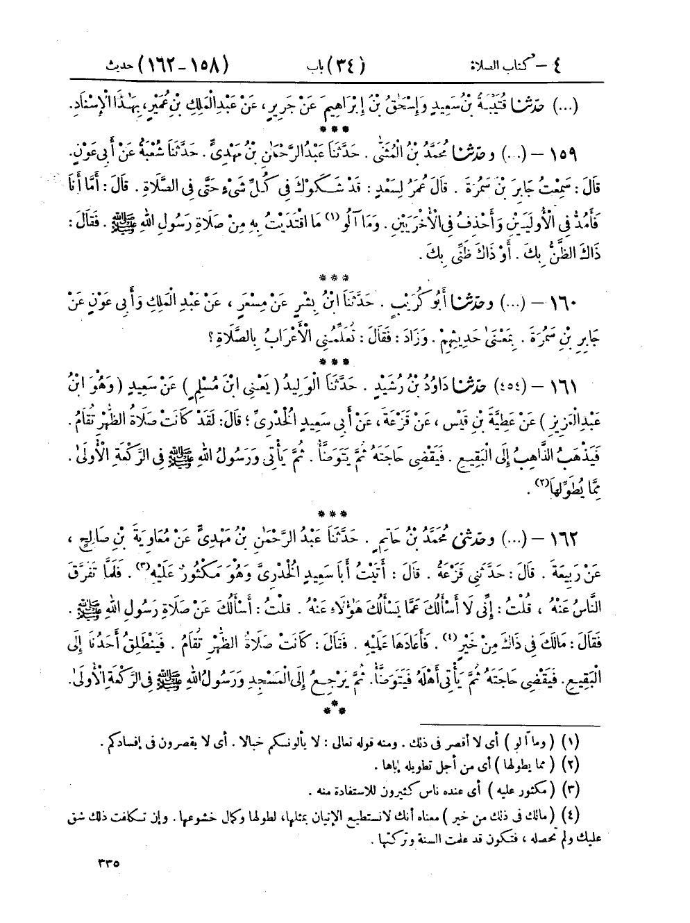 ١٦٢ - (٤٥٤) وَحَدَّثَنِي مُحَمَّدُ بْنُ حَاتِمٍ، حَدَّثَنَا عَبْدُ الرَّحْمَنِ بْنُ مَهْدِيٍّ، عَنْ مُعَاوِيَةَ بْنِ صَالِحٍ، عَنْ رَبِيعَةَ، قَالَ: حَدَّثَنِي قَزْعَةُ، قَالَ: أَتَيْتُ أَبَا سَعِيدٍ الْخُدْرِيَّ، وَهُوَ مَكْثُورٌ عَلَيْهِ فَلَمَّا تَفَرَّقَ النَّاسُ عَنْهُ قُلْتُ: إِنِّي لَا أَسْأَلُكَ عَمَّا يَسْأَلُكَ هَؤُلَاءِ عَنْهُ قُلْتُ: أَسْأَلُكَ عَنْ صَلَاةِ رَسُولِ اللهِ صَلَّى اللهُ عَلَيْهِ وَسَلَّمَ فَقَالَ: مَا لَكَ فِي ذَاكَ مِنْ خَيْرٍ فَأَعَادَهَا عَلَيْهِ. فَقَالَ: «كَانَتْ صَلَاةُ الظُّهْرِ تُقَامُ فَيَنْطَلِقُ أَحَدُنَا إِلَى الْبَقِيعِ فَيَقْضِي حَاجَتَهُ، ثُمَّ يَأْتِي أَهْلَهُ فَيَتَوَضَّأُ، ثُمَّ يَرْجِعُ إِلَى الْمَسْجِدِ وَرَسُولُ اللهِ صَلَّى اللهُ عَلَيْهِ وَسَلَّمَ فِي الرَّكْعَةِ الْأُولَى»