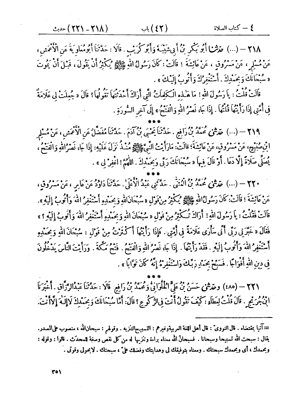 ٢١٨ - (٤٨٤) حَدَّثَنَا أَبُو بَكْرِ بْنُ أَبِي شَيْبَةَ، وَأَبُو كُرَيْبٍ، قَالَا: حَدَّثَنَا أَبُو مُعَاوِيَةَ، عَنِ الْأَعْمَشِ، عَنْ مُسْلِمٍ، عَنْ مَسْرُوقٍ، عَنْ عَائِشَةَ، قَالَتْ: كَانَ رَسُولُ اللهِ صَلَّى اللهُ عَلَيْهِ وَسَلَّمَ يُكْثِرُ أَنْ يَقُولَ قَبْلَ أَنْ يَمُوتَ: «سُبْحَانَكَ وَبِحَمْدِكَ، أَسْتَغْفِرُكَ وَأَتُوبُ إِلَيْكَ» قَالَتْ: قُلْتُ يَا رَسُولَ اللهِ، مَا هَذِهِ الْكَلِمَاتُ الَّتِي أَرَاكَ أَحْدَثْتَهَا تَقُولُهَا؟ قَالَ: «جُعِلَتْ لِي عَلَامَةٌ فِي أُمَّتِي إِذَا رَأَيْتُهَا قُلْتُهَا» {إِذَا جَاءَ نَصْرُ اللهِ وَالْفَتْحُ} [النصر: ١] إِلَى آخِرِ السُّورَةِ