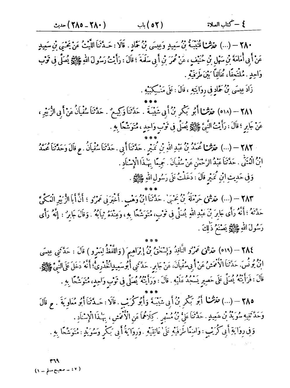 ٢٨١ - (٥١٨) حَدَّثَنَا أَبُو بَكْرِ بْنُ أَبِي شَيْبَةَ، حَدَّثَنَا وَكِيعٌ، حَدَّثَنَا سُفْيَانُ، عَنْ أَبِي الزُّبَيْرِ، عَنْ جَابِرٍ، قَالَ: «رَأَيْتُ النَّبِيَّ صَلَّى اللهُ عَلَيْهِ وَسَلَّمَ يُصَلِّي فِي ثَوْبٍ وَاحِدٍ مُتَوَشِّحًا بِهِ»