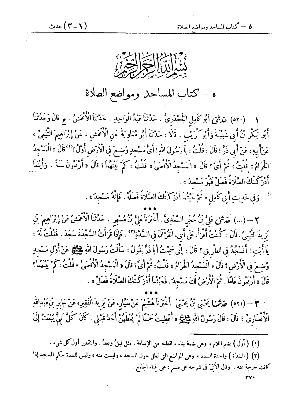 ١ - (٥٢٠) حَدَّثَنِي أَبُو كَامِلٍ الْجَحْدَرِيُّ، حَدَّثَنَا عَبْدُ الْوَاحِدِ، حَدَّثَنَا الْأَعْمَشُ، ح قَالَ: وَحَدَّثَنَا أَبُو بَكْرِ بْنُ أَبِي شَيْبَةَ، وَأَبُو كُرَيْبٍ، قَالَا: حَدَّثَنَا أَبُو مُعَاوِيَةَ، عَنِ الْأَعْمَشِ، عَنْ إِبْرَاهِيمَ التَّيْمِيِّ، عَنْ أَبِيهِ، عَنْ أَبِي ذَرٍّ، قَالَ: قُلْتُ يَا رَسُولَ اللهِ: أَيُّ مَسْجِدٍ وُضِعَ فِي الْأَرْضِ أَوَّلُ؟ قَالَ: «الْمَسْجِدُ الْحَرَامُ» قُلْتُ: ثُمَّ أَيٌّ؟ قَالَ: «الْمَسْجِدُ الْأَقْصَى» قُلْتُ: كَمْ بَيْنَهُمَا؟ قَالَ: «أَرْبَعُونَ سَنَةً، وَأَيْنَمَا أَدْرَكَتْكَ الصَّلَاةُ فَصَلِّ فَهُوَ مَسْجِدٌ» وَفِي حَدِيثِ أَبِي كَامِلٍ «ثُمَّ حَيْثُمَا أَدْرَكَتْكَ الصَّلَاةُ فَصَلِّهِ، فَإِنَّهُ مَسْجِدٌ»