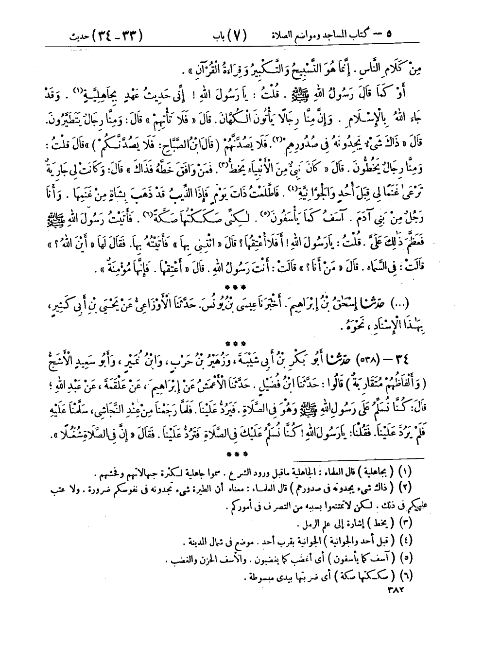 ٣٤ - (٥٣٨) حَدَّثَنَا أَبُو بَكْرِ بْنُ أَبِي شَيْبَةَ، وَزُهَيْرُ بْنُ حَرْبٍ، وَابْنُ نُمَيْرٍ، وَأَبُو سَعِيدٍ الْأَشَجُّ - وَأَلْفَاظُهُمْ مُتَقَارِبَةٌ - قَالُوا: حَدَّثَنَا ابْنُ فُضَيْلٍ، حَدَّثَنَا الْأَعْمَشُ، عَنْ إِبْرَاهِيمَ، عَنْ عَلْقَمَةَ، عَنْ عَبْدِ اللهِ، قَالَ: كُنَّا نُسَلِّمُ عَلَى رَسُولِ اللهِ صَلَّى اللهُ عَلَيْهِ وَسَلَّمَ وَهُوَ فِي الصَّلَاةِ، فَيَرُدُّ عَلَيْنَا، فَلَمَّا رَجَعْنَا مِنْ عِنْدِ النَّجَاشِيِّ، سَلَّمْنَا عَلَيْهِ فَلَمْ يَرُدَّ عَلَيْنَا، فَقُلْنَا: يَا رَسُولَ اللهِ كُنَّا نُسَلِّمُ عَلَيْكَ فِي الصَّلَاةِ فَتَرُدُّ عَلَيْنَا، فَقَالَ: «إِنَّ فِي الصَّلَاةِ شُغْلًا»