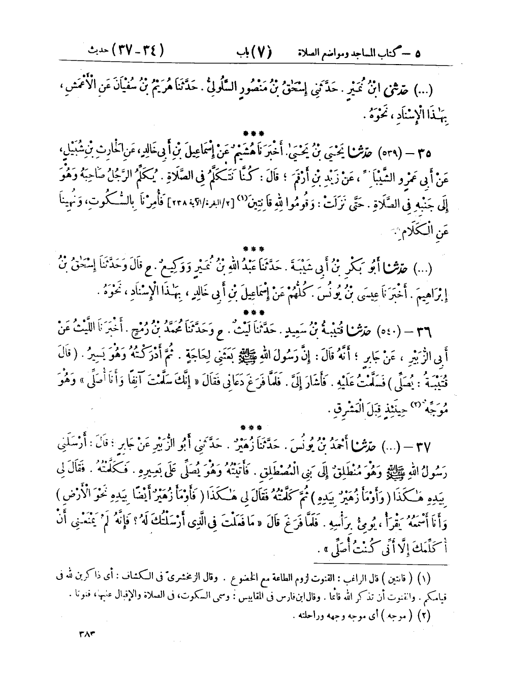 ٣٥ - (٥٣٩) حَدَّثَنَا يَحْيَى بْنُ يَحْيَى، أَخْبَرَنَا هُشَيْمٌ، عَنْ إِسْمَاعِيلَ بْنِ أَبِي خَالِدٍ، عَنِ الْحَارِثِ بْنِ شُبَيْلٍ، عَنْ أَبِي عَمْرٍو الشَّيْبَانِيِّ، عَنْ زَيْدِ بْنِ أَرْقَمَ، قَالَ:: " كُنَّا نَتَكَلَّمُ فِي الصَّلَاةِ يُكَلِّمُ الرَّجُلُ صَاحِبَهُ وَهُوَ إِلَى جَنْبِهِ فِي الصَّلَاةِ حَتَّى نَزَلَتْ {وَقُومُوا لِلَّهِ قَانِتِينَ} [البقرة: ٢٣٨] فَأُمِرْنَا بِالسُّكُوتِ، وَنُهِينَا عَنِ الْكَلَامِ "