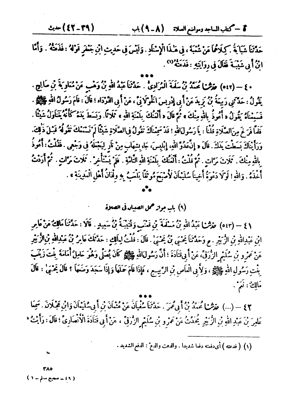 ٤٢ - (٥٤٣) حَدَّثَنَا مُحَمَّدُ بْنُ أَبِي عُمَرَ، حَدَّثَنَا سُفْيَانُ، عَنْ عُثْمَانَ بْنِ أَبِي سُلَيْمَانَ، وَابْنِ عَجْلَانَ سَمِعَا عَامِرَ بْنَ عَبْدِ اللهِ بْنِ الزُّبَيْرِ، يُحَدِّثُ عَنْ عَمْرِو بْنِ سُلَيْمٍ الزُّرَقِيِّ، عَنْ أَبِي قَتَادَةَ الْأَنْصَارِيِّ، قَالَ: «رَأَيْتُ النَّبِيَّ صَلَّى اللهُ عَلَيْهِ وَسَلَّمَ يَؤُمُّ النَّاسَ وَأُمَامَةُ بِنْتُ أَبِي الْعَاصِ وَهِيَ ابْنَةُ زَيْنَبَ بِنْتُ النَّبِيِّ صَلَّى اللهُ عَلَيْهِ وَسَلَّمَ عَلَى عَاتِقِهِ، فَإِذَا رَكَعَ وَضَعَهَا، وَإِذَا رَفَعَ مِنَ السُّجُودِ أَعَادَهَا»