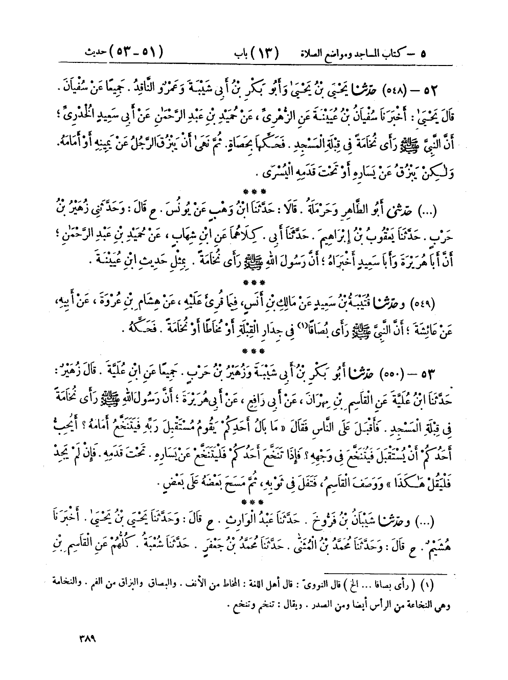 ٥٢ - (٥٤٨) حَدَّثَنَا يَحْيَى بْنُ يَحْيَى، وَأَبُو بَكْرِ بْنُ أَبِي شَيْبَةَ، وَعَمْرٌو النَّاقِدُ، جَمِيعًا عَنْ سُفْيَانَ، قَالَ يَحْيَى: أَخْبَرَنَا سُفْيَانُ بْنُ عُيَيْنَةَ، عَنِ الزُّهْرِيِّ، عَنْ حُمَيْدِ بْنِ عَبْدِ الرَّحْمَنِ، عَنْ أَبِي سَعِيدٍ الْخُدْرِيِّ: «أَنَّ النَّبِيَّ صَلَّى اللهُ عَلَيْهِ وَسَلَّمَ رَأَى نُخَامَةً فِي قِبْلَةِ الْمَسْجِدِ فَحَكَّهَا بِحَصَاةٍ، ثُمَّ نَهَى أَنْ يَبْزُقَ الرَّجُلُ عَنْ يَمِينِهِ، أَوْ أَمَامَهُ، وَلَكِنْ يَبْزُقُ، عَنْ يَسَارِهِ أَوْ تَحْتَ قَدَمِهِ الْيُسْرَى» ح