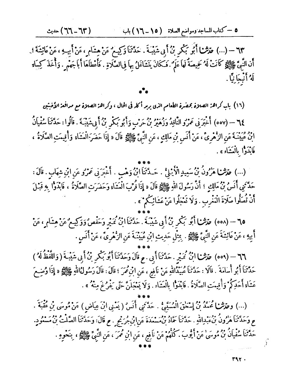 ١٦ - بَابُ كَرَاهَةِ الصَّلَاةِ بِحَضْرَةِ الطَّعَامَ الَّذِي يُرِيدُ أَكْلَهُ فِي الْحَالِ وَكَرَاهَةِ الصَّلَاةِ مَعَ مُدَافَعَةِ الْأَخْبَثَيْنِ
