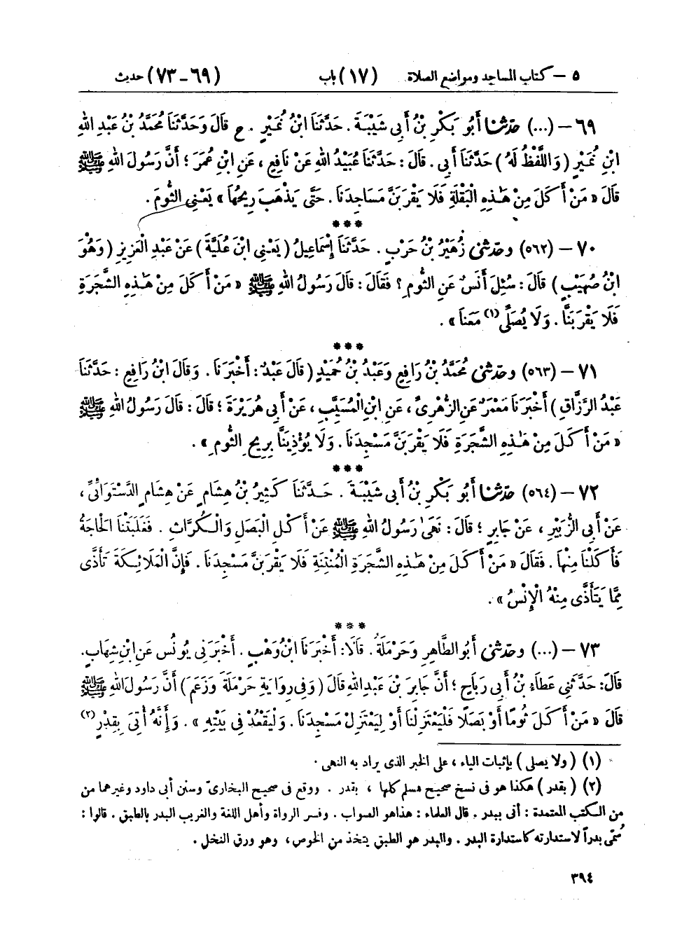٦٩ - (٥٦١) حَدَّثَنَا أَبُو بَكْرِ بْنُ أَبِي شَيْبَةَ، حَدَّثَنَا ابْنُ نُمَيْرٍ، ح قَالَ: وَحَدَّثَنَا مُحَمَّدُ بْنُ عَبْدِ اللهِ بْنِ نُمَيْرٍ - وَاللَّفْظُ لَهُ - حَدَّثَنَا أَبِي، قَالَ: حَدَّثَنَا عُبَيْدُ اللهِ، عَنْ نَافِعٍ، عَنِ ابْنِ عُمَرَ، أَنَّ رَسُولَ اللهِ صَلَّى اللهُ عَلَيْهِ وَسَلَّمَ، قَالَ: «مَنْ أَكَلَ مِنْ هَذِهِ الْبَقْلَةِ فَلَا يَقْرَبَنَّ مَسَاجِدَنَا، حَتَّى يَذْهَبَ رِيحُهَا» يَعْنِي الثُّومَ