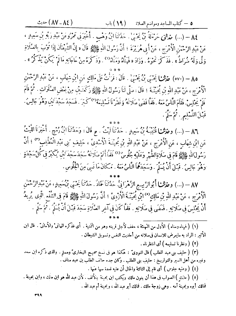 ٨٧ - (٥٧٠) وَحَدَّثَنَا أَبُو الرَّبِيعِ الزَّهْرَانِيُّ، حَدَّثَنَا حَمَّادٌ، حَدَّثَنَا يَحْيَى بْنُ سَعِيدٍ، عَنْ عَبْدِ الرَّحْمَنِ الْأَعْرَجِ، عَنْ عَبْدِ اللهِ بْنِ مَالِكٍ ابْنِ بُحَيْنَةَ الْأَزْدِيِّ: «أَنَّ رَسُولَ اللهِ صَلَّى اللهُ عَلَيْهِ وَسَلَّمَ قَامَ فِي الشَّفْعِ الَّذِي يُرِيدُ أَنْ يَجْلِسَ فِي صَلَاتِهِ، فَمَضَى فِي صَلَاتِهِ، فَلَمَّا كَانَ فِي آخِرِ الصَّلَاةِ سَجَدَ قَبْلَ أَنْ يُسَلِّمَ، ثُمَّ سَلَّمَ»