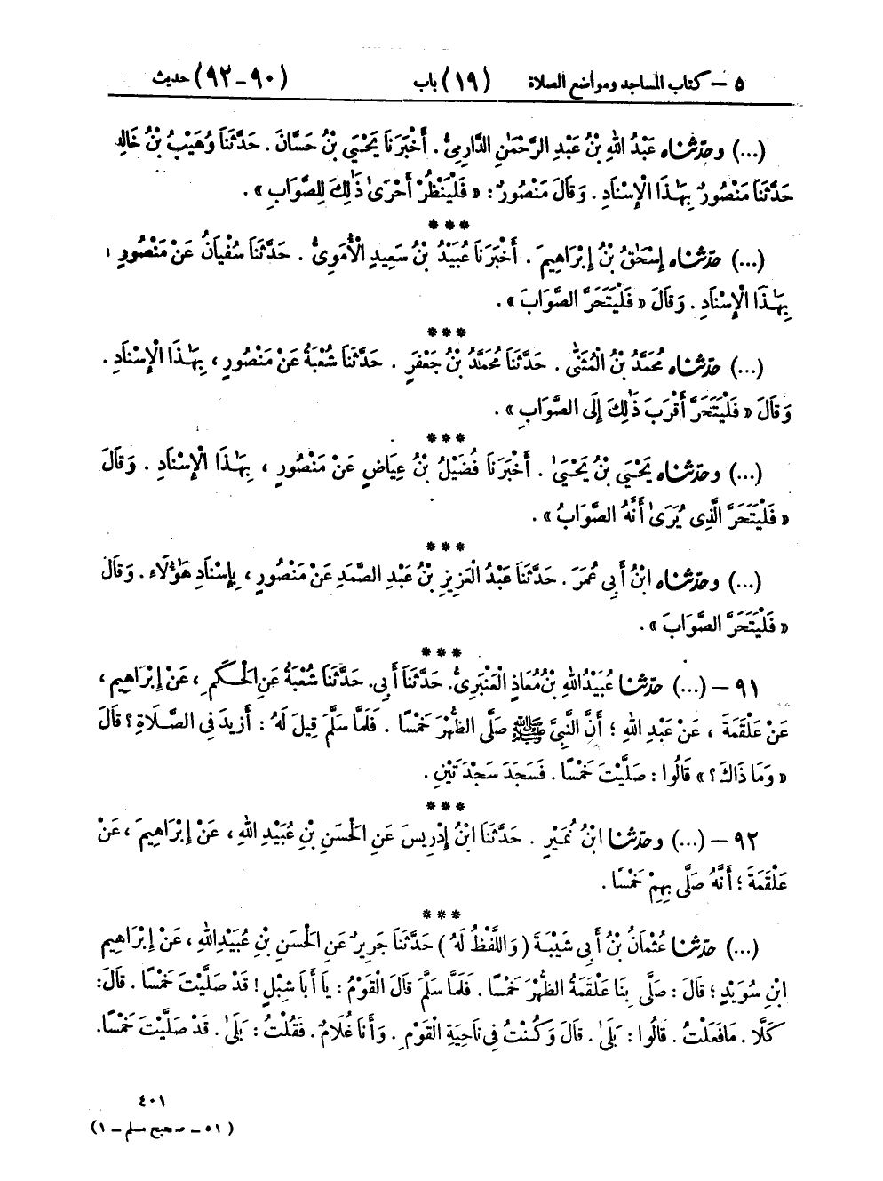 ٩٢ - (٥٧٢) وَحَدَّثَنَا ابْنُ نُمَيْرٍ، حَدَّثَنَا ابْنُ إِدْرِيسَ، عَنِ الْحَسَنِ بْنِ عُبَيْدِ اللهِ، عَنْ إِبْرَاهِيمَ، عَنْ عَلْقَمَةَ، أَنَّهُ صَلَّى بِهِمْ خَمْسًا، ح