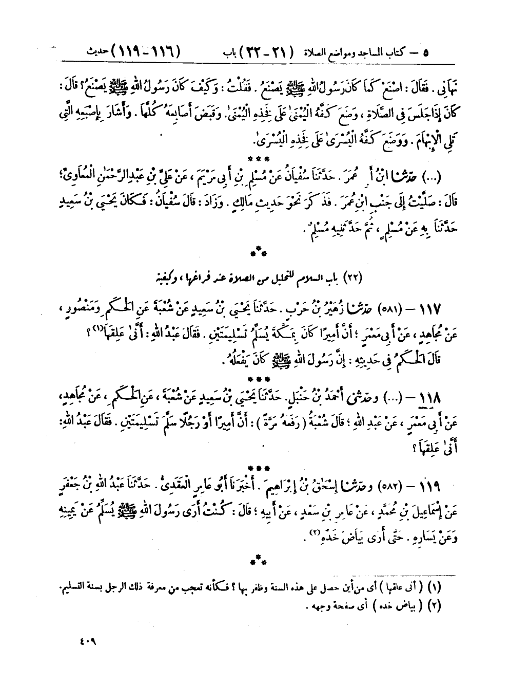 ١١٨ - (٥٨١) وَحَدَّثَنِي أَحْمَدُ بْنُ حَنْبَلٍ، حَدَّثَنَا يَحْيَى بْنُ سَعِيدٍ، عَنْ شُعْبَةَ، عَنِ الْحَكَمِ، عَنْ مُجَاهِدٍ، عَنْ أَبِي مَعْمَرٍ، عَنْ عَبْدِ اللهِ، - قَالَ شُعْبَةُ: رَفَعَهُ مَرَّةً - «أَنَّ أَمِيرًا أَوْ رَجُلًا سَلَّمَ تَسْلِيمَتَيْنِ، فَقَالَ عَبْدُ اللهِ أَنَّى عَلِقَهَا»