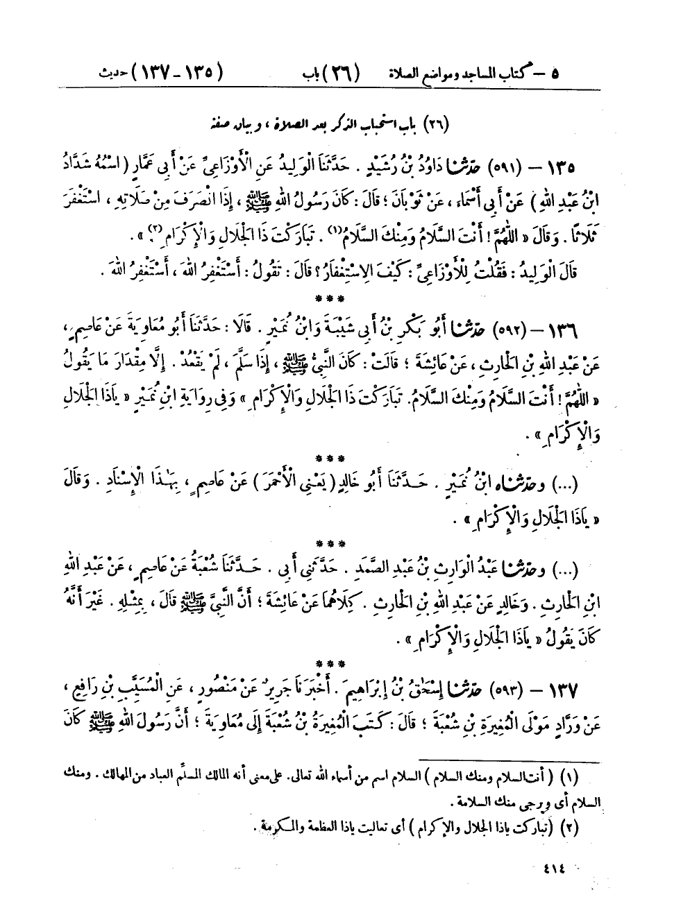 ١٣٦ - (٥٩٢) حَدَّثَنَا أَبُو بَكْرِ بْنُ أَبِي شَيْبَةَ، وَابْنُ نُمَيْرٍ، قَالَا: حَدَّثَنَا أَبُو مُعَاوِيَةَ، عَنْ عَاصِمٍ، عَنْ عَبْدِ اللهِ بْنِ الْحَارِثِ، عَنْ عَائِشَةَ، قَالَتْ: كَانَ النَّبِيُّ صَلَّى اللهُ عَلَيْهِ وَسَلَّمَ إِذَا سَلَّمَ لَمْ يَقْعُدْ إِلَّا مِقْدَارَ مَا يَقُولُ: «اللهُمَّ أَنْتَ السَّلَامُ وَمِنْكَ السَّلَامُ، تَبَارَكْتَ ذَا الْجَلَالِ وَالْإِكْرَامِ» وَفِي رِوَايَةِ ابْنِ نُمَيْرٍ «يَا ذَا الْجَلَالِ وَالْإِكْرَامِ»