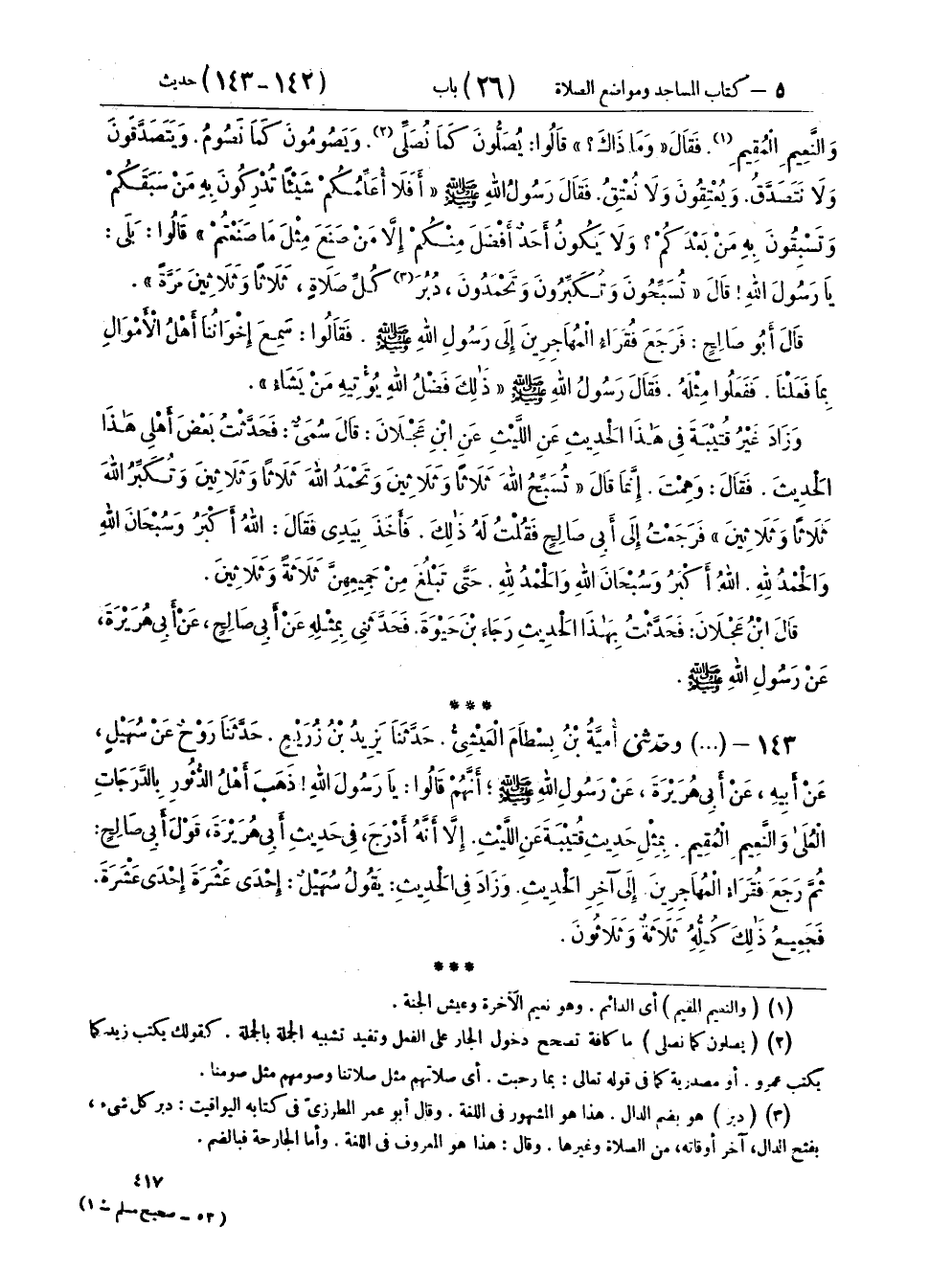 ١٤٣ - (٥٩٥) وَحَدَّثَنِي أُمَيَّةُ بْنُ بِسْطَامَ الْعَيْشِيُّ، حَدَّثَنَا يَزِيدُ بْنُ زُرَيْعٍ، حَدَّثَنَا رَوْحٌ، عَنْ سُهَيْلٍ، عَنْ أَبِيهِ، عَنْ أَبِي هُرَيْرَةَ، عَنْ رَسُولِ اللهِ صَلَّى اللهُ عَلَيْهِ وَسَلَّمَ أَنَّهُمْ قَالُوا: يَا رَسُولَ اللهِ ذَهَبَ أَهْلُ الدُّثُورِ بِالدَّرَجَاتِ الْعُلَى، وَالنَّعِيمِ الْمُقِيمِ، بِمِثْلِ حَدِيثِ قُتَيْبَةَ، عَنِ اللَّيْثِ إِلَّا أَنَّهُ أَدْرَجَ فِي حَدِيثِ أَبِي هُرَيْرَةَ قَوْلَ أَبِي صَالِحٍ، ثُمَّ رَجَعَ فُقَرَاءُ الْمُهَاجِرِينَ إِلَى آخِرِ الْحَدِيثِ، وَزَادَ فِي الْحَدِيثِ: يَقُولُ سُهَيْلٌ: إِحْدَى عَشْرَةَ، إِحْدَى عَشْرَةَ، فَجَمِيعُ ذَلِكَ كُلِّهِ ثَلَاثَةٌ وَثَلَاثُونَ