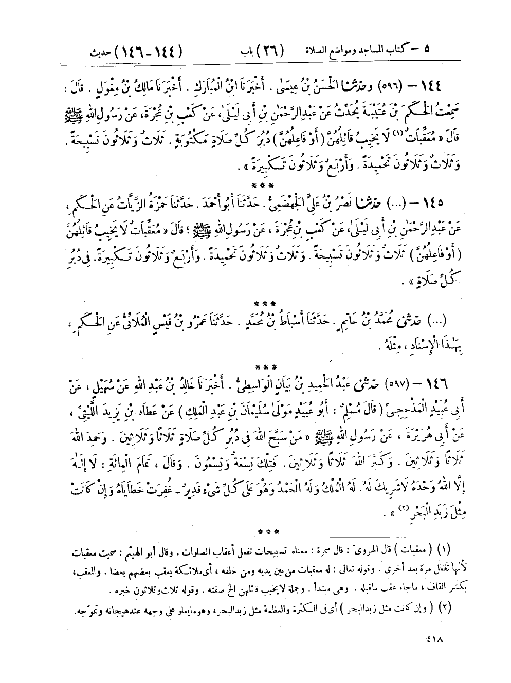 ١٤٤ - (٥٩٦) وحَدَّثَنَا الْحَسَنُ بْنُ عِيسَى، أَخْبَرَنَا ابْنُ الْمُبَارَكِ، أَخْبَرَنَا مَالِكُ بْنُ مِغْوَلٍ، قَالَ: سَمِعْتُ الْحَكَمَ بْنَ عُتَيْبَةَ، يُحَدِّثُ عَنْ عَبْدِ الرَّحْمَنِ بْنِ أَبِي لَيْلَى، عَنْ كَعْبِ بْنِ عُجْرَةَ، عَنْ رَسُولِ اللهِ صَلَّى اللهُ عَلَيْهِ وَسَلَّمَ قَالَ: «مُعَقِّبَاتٌ لَا يَخِيبُ قَائِلُهُنَّ - أَوْ فَاعِلُهُنَّ - دُبُرَ كُلِّ صَلَاةٍ مَكْتُوبَةٍ، ثَلَاثٌ وَثَلَاثُونَ تَسْبِيحَةً، وَثَلَاثٌ وَثَلَاثُونَ تَحْمِيدَةً، وَأَرْبَعٌ وَثَلَاثُونَ تَكْبِيرَةً»