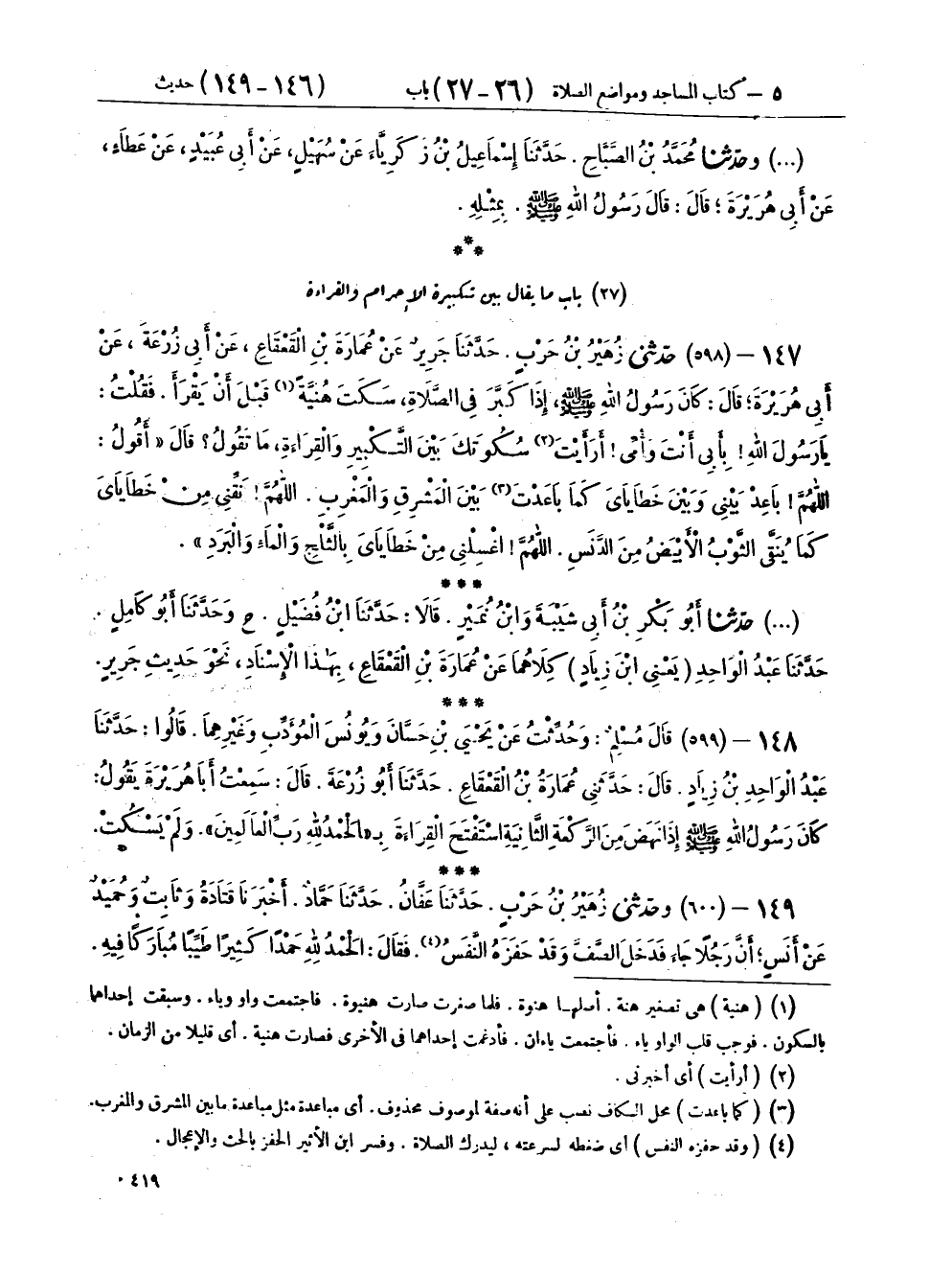 ١٤٧ - (٥٩٨) حَدَّثَنِي زُهَيْرُ بْنُ حَرْبٍ، حَدَّثَنَا جَرِيرٌ، عَنْ عُمَارَةَ بْنِ الْقَعْقَاعِ، عَنْ أَبِي زُرْعَةَ، عَنْ أَبِي هُرَيْرَةَ، قَالَ: كَانَ رَسُولُ اللهِ صَلَّى اللهُ عَلَيْهِ وَسَلَّمَ، إِذَا كَبَّرَ فِي الصَّلَاةِ، سَكَتَ هُنَيَّةً قَبْلَ أَنْ يَقْرَأَ، فَقُلْتُ: يَا رَسُولَ اللهِ بِأَبِي أَنْتَ وَأُمِّي أَرَأَيْتَ سُكُوتَكَ بَيْنَ التَّكْبِيرِ وَالْقِرَاءَةِ، مَا تَقُولُ؟ قَالَ " أَقُولُ: اللهُمَّ بَاعِدْ بَيْنِي وَبَيْنَ خَطَايَايَ كَمَا بَاعَدْتَ بَيْنَ الْمَشْرِقِ وَالْمَغْرِبِ، اللهُمَّ نَقِّنِي مِنْ خَطَايَايَ كَمَا يُنَقَّى الثَّوْبُ الْأَبْيَضُ مِنَ الدَّنَسِ، اللهُمَّ اغْسِلْنِي مِنْ خَطَايَايَ بِالثَّلْجِ وَالْمَاءِ وَالْبَرَدِ "