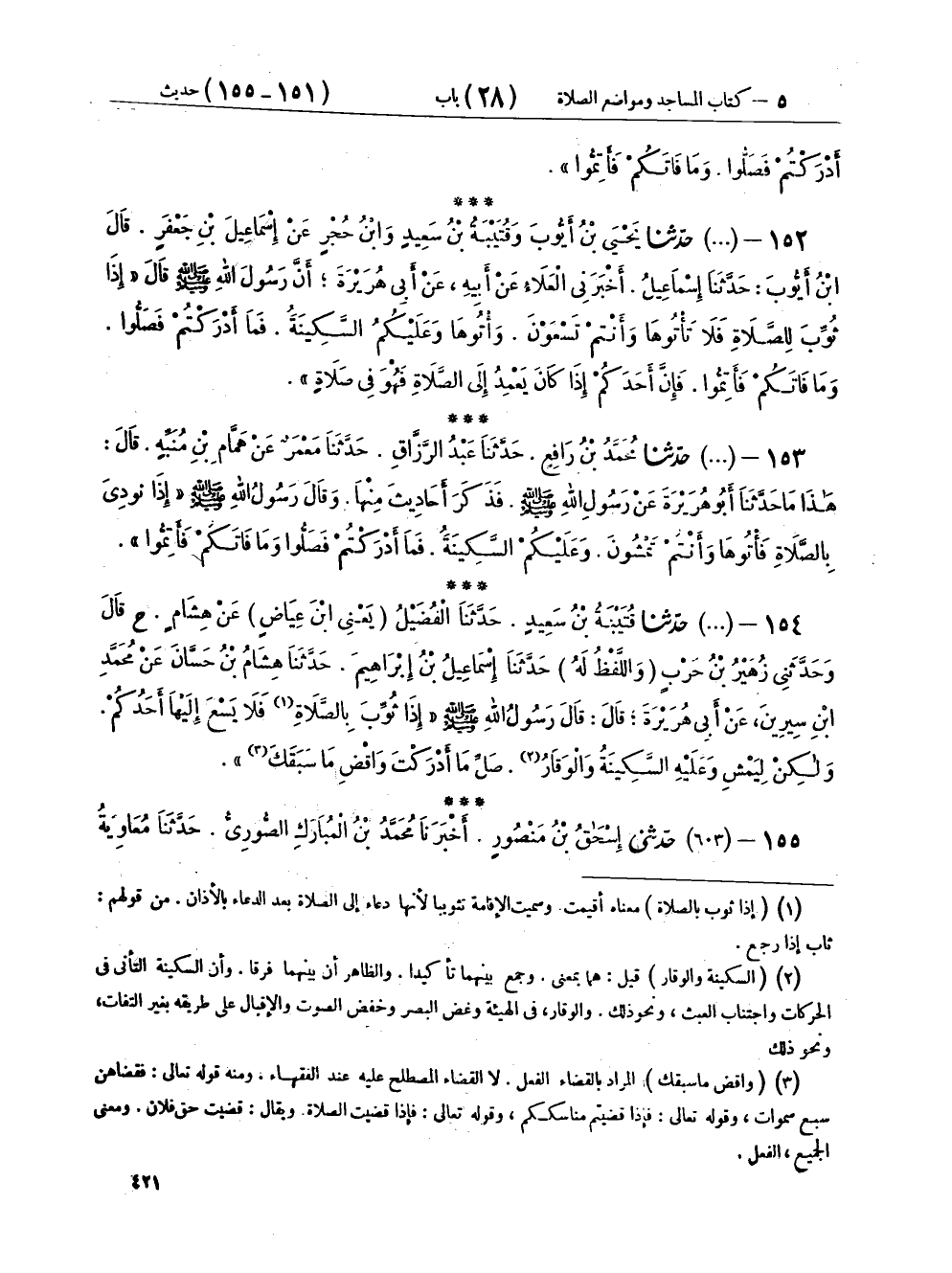 ١٥٤ - (٦٠٢) حَدَّثَنَا قُتَيْبَةُ بْنُ سَعِيدٍ، حَدَّثَنَا الْفُضَيْلُ يَعْنِي ابْنَ عِيَاضٍ، عَنْ هِشَامٍ، ح قَالَ: وَحَدَّثَنِي زُهَيْرُ بْنُ حَرْبٍ، وَاللَّفْظُ لَهُ، حَدَّثَنَا إِسْمَاعِيلُ بْنُ إِبْرَاهِيمَ، حَدَّثَنَا هِشَامُ بْنُ حَسَّانَ، عَنْ مُحَمَّدِ بْنِ سِيرِينَ، عَنْ أَبِي هُرَيْرَةَ، قَالَ: قَالَ رَسُولُ اللهِ صَلَّى اللهُ عَلَيْهِ وَسَلَّمَ: «إِذَا ثُوِّبَ بِالصَّلَاةِ فَلَا يَسْعَ إِلَيْهَا أَحَدُكُمْ، وَلَكِنْ لِيَمْشِ وَعَلَيْهِ السَّكِينَةُ وَالْوَقَارُ، صَلِّ مَا أَدْرَكْتَ، وَاقْضِ مَا سَبَقَكَ»