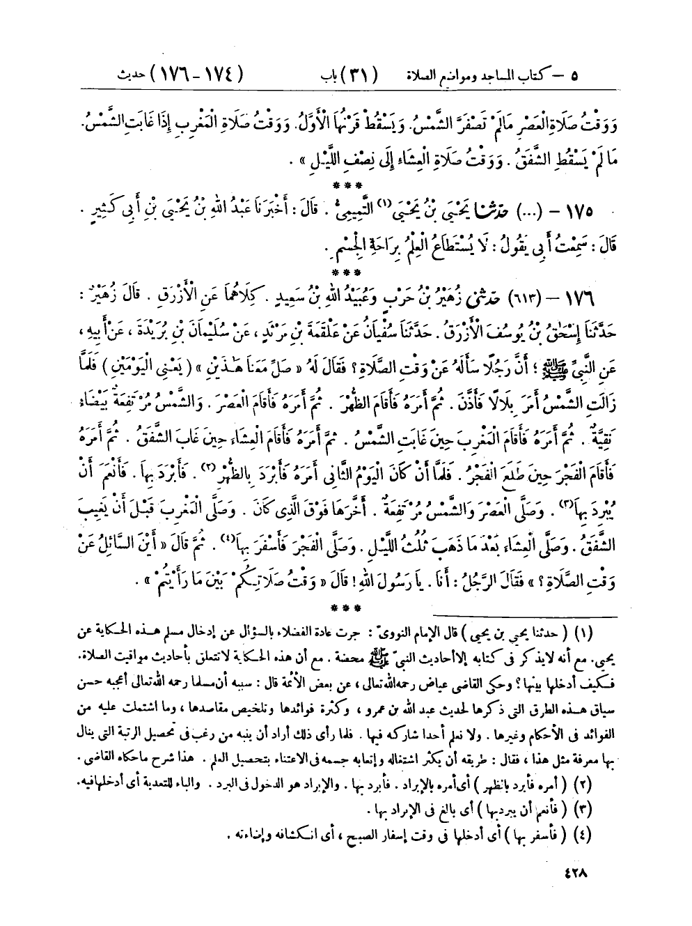١٧٦ - (٦١٣) حَدَّثَنِي زُهَيْرُ بْنُ حَرْبٍ، وَعُبَيْدُ اللهِ بْنُ سَعِيدٍ، كِلَاهُمَا عَنِ الْأَزْرَقِ، قَالَ زُهَيْرٌ: حَدَّثَنَا إِسْحَاقُ بْنُ يُوسُفَ الْأَزْرَقُ، حَدَّثَنَا سُفْيَانُ، عَنْ عَلْقَمَةَ بْنِ مَرْثَدٍ، عَنْ سُلَيْمَانَ بْنِ بُرَيْدَةَ، عَنْ أَبِيهِ، عَنِ النَّبِيِّ صَلَّى اللهُ عَلَيْهِ وَسَلَّمَ، أَنَّ رَجُلًا سَأَلَهُ عَنْ وَقْتِ الصَّلَاةِ، فَقَالَ لَهُ: «صَلِّ مَعَنَا هَذَيْنِ - يَعْنِي الْيَوْمَيْنِ - فَلَمَّا زَالَتِ الشَّمْسُ أَمَرَ بِلَالًا فَأَذَّنَ، ثُمَّ أَمَرَهُ، فَأَقَامَ الظُّهْرَ، ثُمَّ أَمَرَهُ، فَأَقَامَ الْعَصْرَ وَالشَّمْسُ مُرْتَفِعَةٌ بَيْضَاءُ نَقِيَّةٌ، ثُمَّ أَمَرَهُ فَأَقَامَ الْمَغْرِبَ حِينَ غَابَتِ الشَّمْسُ، ثُمَّ أَمَرَهُ فَأَقَامَ الْعِشَاءَ حِينَ غَابَ الشَّفَقُ، ثُمَّ أَمَرَهُ فَأَقَامَ الْفَجْرَ حِينَ طَلَعَ الْفَجْرَ، فَلَمَّا أَنْ كَانَ الْيَوْمُ الثَّانِي أَمَرَهُ فَأَبْرَدَ بِالظُّهْرِ، فَأَبْرَدَ بِهَا، فَأَنْعَمَ أَنْ يُبْرِدَ بِهَا، وَصَلَّى الْعَصْرَ وَالشَّمْسُ مُرْتَفِعَةٌ أَخَّرَهَا فَوْقَ الَّذِي كَانَ، وَصَلَّى الْمَغْرِبَ قَبْلَ أَنْ يَغِيبَ الشَّفَقُ، وَصَلَّى الْعِشَاءَ بَعْدَمَا ذَهَبَ ثُلُثُ اللَّيْلِ، وَصَلَّى الْفَجْرَ فَأَسْفَرَ بِهَا»، ثُمَّ قَالَ: «أَيْنَ السَّائِلُ عَنْ وَقْتِ الصَّلَاةِ؟» فَقَالَ الرَّجُلُ: أَنَا، يَا رَسُولَ اللهِ، قَالَ: «وَقْتُ صَلَاتِكُمْ بَيْنَ مَا رَأَيْتُمْ»