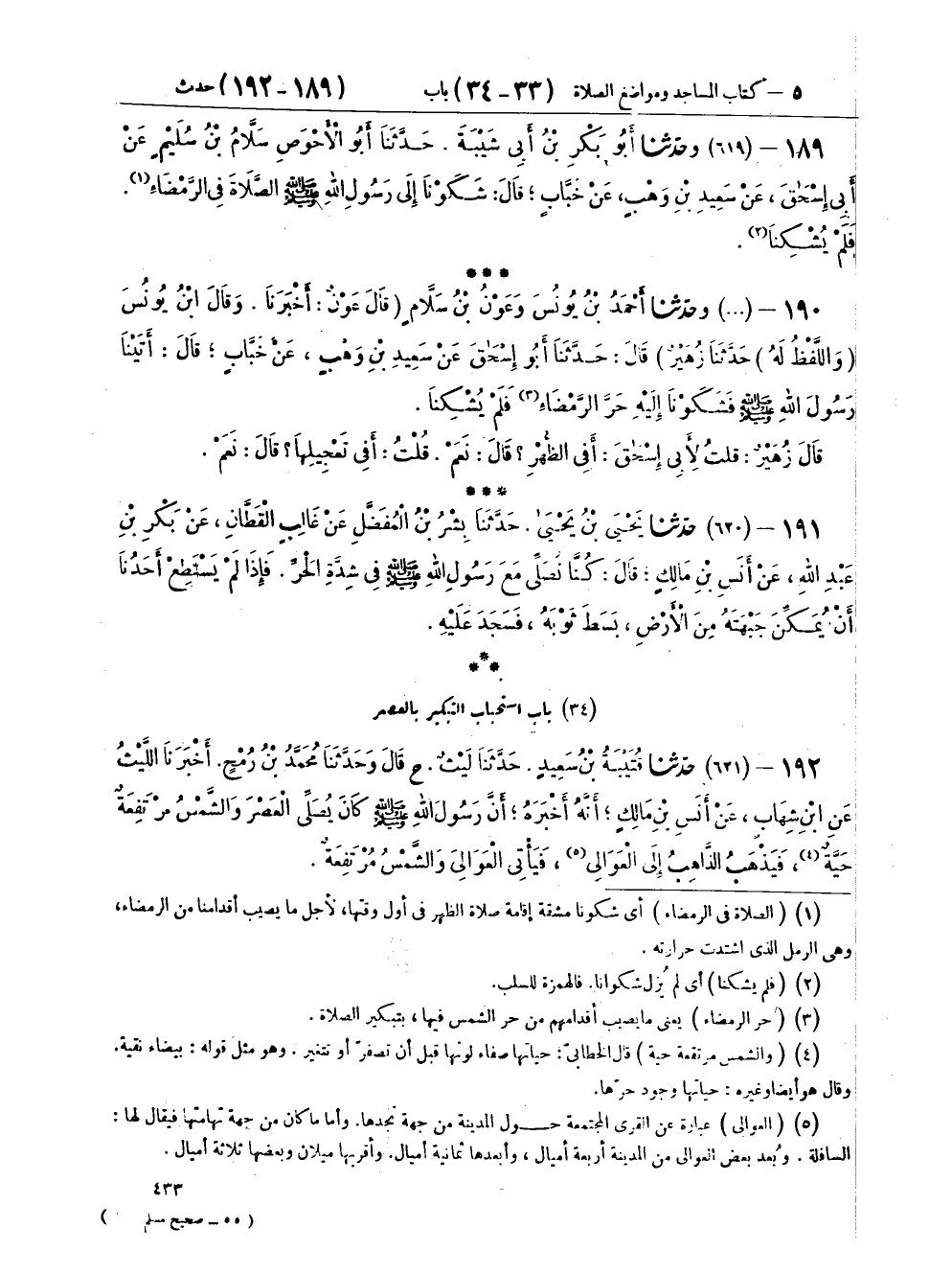 ١٩٠ - (٦١٩) وَحَدَّثَنَا أَحْمَدُ بْنُ يُونُسَ، وَعَوْنُ بْنُ سَلَّامٍ، قَالَ عَوْنٌ: أَخْبَرَنَا، وقَالَ ابْنُ يُونُسَ: وَاللَّفْظُ لَهُ، حَدَّثَنَا زُهَيْرٌ، قَالَ: حَدَّثَنَا أَبُو إِسْحَاقَ، عَنْ سَعِيدِ بْنِ وَهْبٍ، عَنْ خَبَّابٍ، قَالَ: أَتَيْنَا رَسُولَ اللهِ صَلَّى اللهُ عَلَيْهِ وَسَلَّمَ «فَشَكَوْنَا إِلَيْهِ حَرَّ الرَّمْضَاءِ، فَلَمْ يُشْكِنَا» قَالَ زُهَيْرٌ: قُلْتُ لِأَبِي إِسْحَاقَ: " أَفِي الظُّهْرِ؟ قَالَ: نَعَمْ، قُلْتُ: أَفِي تَعْجِيلِهَا؟ قَالَ: نَعَمْ "