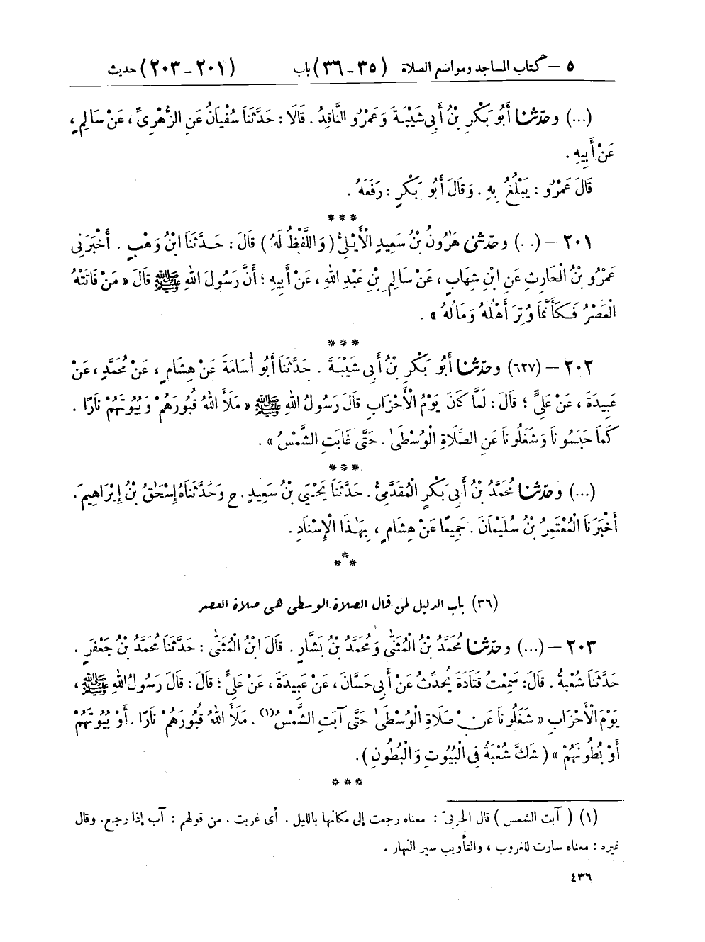 ٢٠٢ - (٦٢٧) وَحَدَّثَنَا أَبُو بَكْرِ بْنُ أَبِي شَيْبَةَ، حَدَّثَنَا أَبُو أُسَامَةَ، عَنْ هِشَامٍ، عَنْ مُحَمَّدٍ، عَنْ عَبِيدَةَ، عَنْ عَلِيٍّ، قَالَ: لَمَّا كَانَ يَوْمُ الْأَحْزَابِ، قَالَ رَسُولُ اللهِ صَلَّى اللهُ عَلَيْهِ وَسَلَّمَ: «مَلَأَ اللهُ قُبُورَهُمْ وَبُيُوتَهُمْ نَارًا، كَمَا حَبَسُونَا، وَشَغَلُونَا عَنِ الصَّلَاةِ الْوُسْطَى، حَتَّى غَابَتِ الشَّمْسُ»