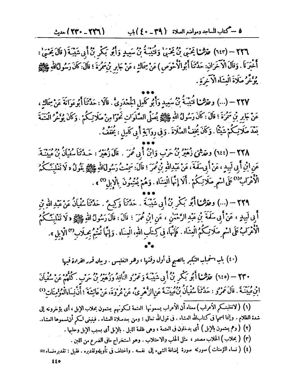 ٢٢٩ - (٦٤٤) وَحَدَّثَنَا أَبُو بَكْرِ بْنُ أَبِي شَيْبَةَ، حَدَّثَنَا وَكِيعٌ، حَدَّثَنَا سُفْيَانُ، عَنْ عَبْدِ اللهِ بْنِ أَبِي لَبِيدٍ، عَنْ أَبِي سَلَمَةَ بْنِ عَبْدِ الرَّحْمَنِ، عَنِ ابْنِ عُمَرَ، قَالَ: قَالَ رَسُولُ اللهِ صَلَّى اللهُ عَلَيْهِ وَسَلَّمَ: «لَا تَغْلِبَنَّكُمُ الْأَعْرَابُ عَلَى اسْمِ صَلَاتِكُمُ الْعِشَاءِ، فَإِنَّهَا فِي كِتَابِ اللهِ الْعِشَاءُ، وَإِنَّهَا تُعْتِمُ بِحِلَابِ الْإِبِلِ»