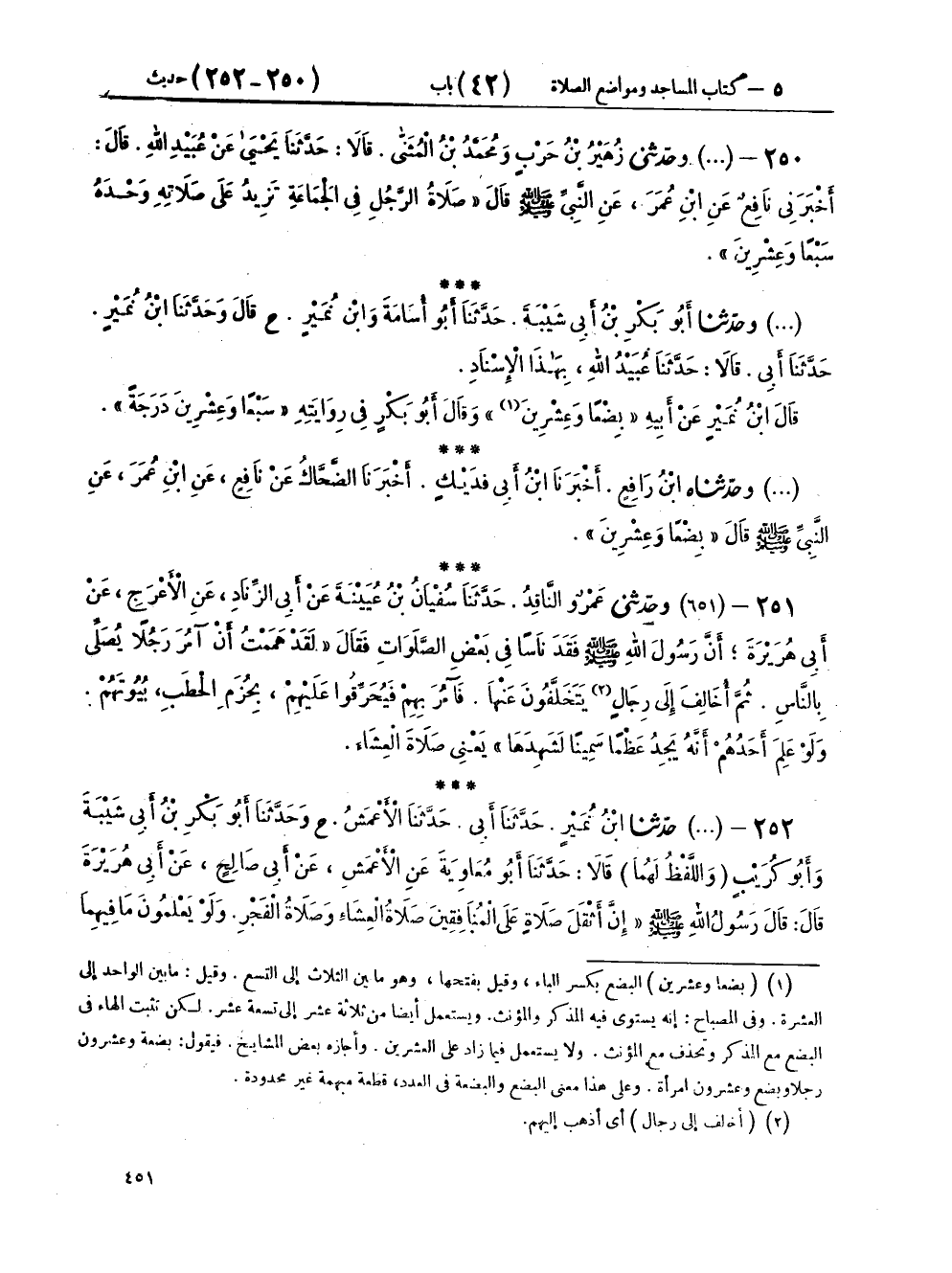 (٦٥٠) وَحَدَّثَنَا أَبُو بَكْرِ بْنُ أَبِي شَيْبَةَ، حَدَّثَنَا أَبُو أُسَامَةَ، وَابْنُ نُمَيْرٍ، ح قَالَ: وَحَدَّثَنَا ابْنُ نُمَيْرٍ، حَدَّثَنَا أَبِي، قَالَا: حَدَّثَنَا عُبَيْدُ اللهِ بِهَذَا الْإِسْنَادِ، قَالَ ابْنُ نُمَيْرٍ، عَنْ أَبِيهِ: بِضْعًا وَعِشْرِينَ، وقَالَ أَبُو بَكْرٍ فِي رِوَايَتِهِ: سَبْعًا وَعِشْرِينَ دَرَجَةً،
