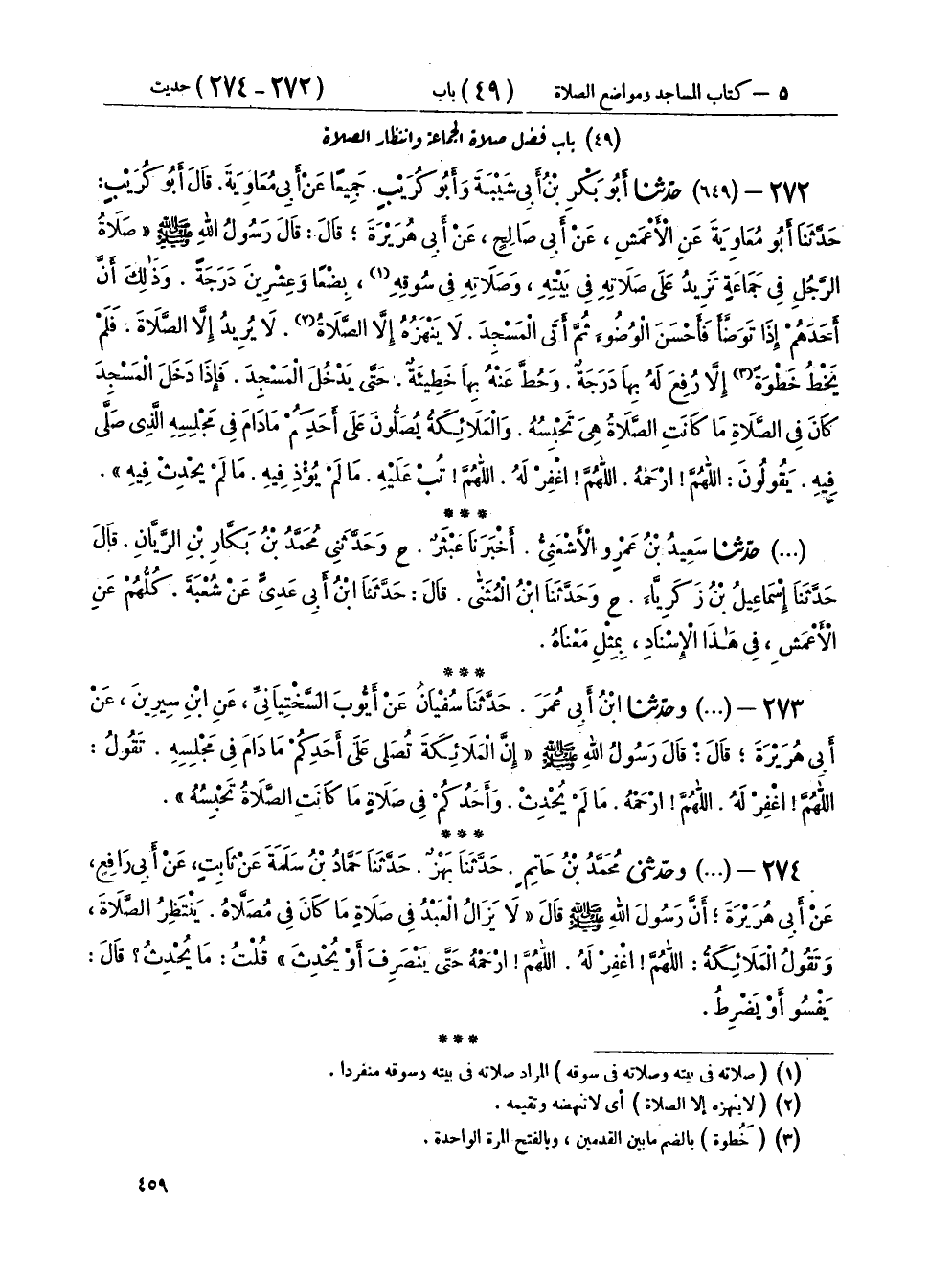 ٢٧٢ - (٦٤٩) حَدَّثَنَا أَبُو بَكْرِ بْنُ أَبِي شَيْبَةَ، وَأَبُو كُرَيْبٍ، جَمِيعًا عَنْ أَبِي مُعَاوِيَةَ، قَالَ أَبُو كُرَيْبٍ: حَدَّثَنَا أَبُو مُعَاوِيَةَ، عَنِ الْأَعْمَشِ، عَنْ أَبِي صَالِحٍ، عَنْ أَبِي هُرَيْرَةَ، قَالَ: قَالَ رَسُولُ اللهِ صَلَّى اللهُ عَلَيْهِ وَسَلَّمَ: " صَلَاةُ الرَّجُلِ فِي جَمَاعَةٍ تَزِيدُ عَلَى صَلَاتِهِ فِي بَيْتِهِ، وَصَلَاتِهِ فِي سُوقِهِ، بِضْعًا وَعِشْرِينَ دَرَجَةً، وَذَلِكَ أَنَّ أَحَدَهُمْ إِذَا تَوَضَّأَ فَأَحْسَنَ الْوُضُوءَ، ثُمَّ أَتَى الْمَسْجِدَ لَا يَنْهَزُهُ إِلَّا الصَّلَاةُ، لَا يُرِيدُ إِلَّا الصَّلَاةَ، فَلَمْ يَخْطُ خَطْوَةً إِلَّا رُفِعَ لَهُ بِهَا دَرَجَةٌ، وَحُطَّ عَنْهُ بِهَا خَطِيئَةٌ، حَتَّى يَدْخُلَ الْمَسْجِدَ، فَإِذَا دَخَلَ الْمَسْجِدَ كَانَ فِي الصَّلَاةِ مَا كَانَتِ الصَّلَاةُ هِيَ تَحْبِسُهُ، وَالْمَلَائِكَةُ يُصَلُّونَ عَلَى أَحَدِكُمْ مَا دَامَ فِي مَجْلِسِهِ الَّذِي صَلَّى فِيهِ، يَقُولُونَ: اللهُمَّ ارْحَمْهُ، اللهُمَّ اغْفِرْ لَهُ، اللهُمَّ تُبْ عَلَيْهِ، مَا لَمْ يُؤْذِ فِيهِ، مَا لَمْ يُحْدِثْ فِيهِ "
