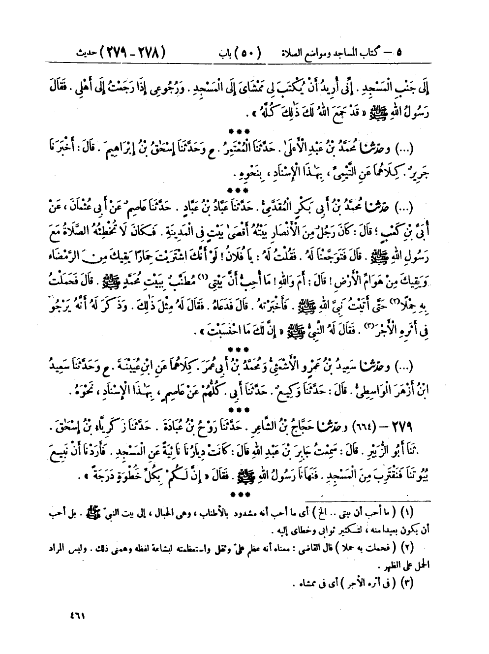 ٢٧٩ - (٦٦٤) وَحَدَّثَنَا حَجَّاجُ بْنُ الشَّاعِرِ، حَدَّثَنَا رَوْحُ بْنُ عُبَادَةَ، حَدَّثَنَا زَكَرِيَّاءُ بْنُ إِسْحَاقَ، حَدَّثَنَا أَبُو الزُّبَيْرِ، قَالَ: سَمِعْتُ جَابِرَ بْنَ عَبْدِ اللهِ، قَالَ: كَانَتْ دِيَارُنَا نَائِيَةً عَنِ الْمَسْجِدِ، فَأَرَدْنَا أَنْ نَبِيعَ بُيُوتَنَا، فَنَقْتَرِبَ مِنَ الْمَسْجِدِ، فَنَهَانَا رَسُولُ اللهِ صَلَّى اللهُ عَلَيْهِ وَسَلَّمَ، فَقَالَ: «إِنَّ لَكُمْ بِكُلِّ خَطْوَةٍ دَرَجَةً»