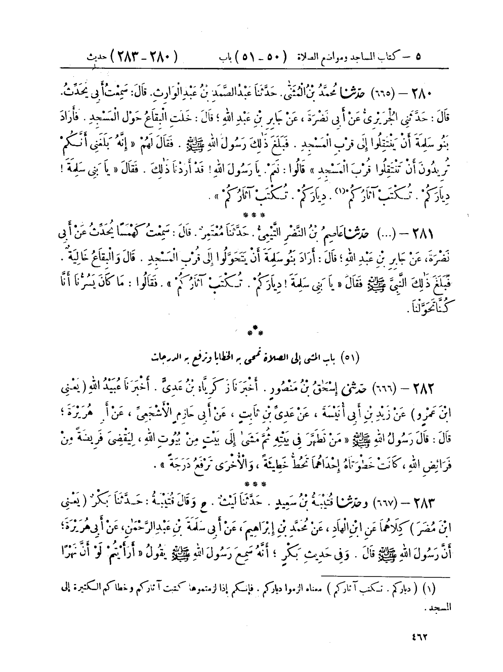 ٢٨٠ - (٦٦٥) حَدَّثَنَا مُحَمَّدُ بْنُ الْمُثَنَّى، حَدَّثَنَا عَبْدُ الصَّمَدِ بْنُ عَبْدِ الْوَارِثِ، قَالَ: سَمِعْتُ أَبِي، يُحَدِّثُ، قَالَ: حَدَّثَنِي الْجُرَيْرِيُّ، عَنْ أَبِي نَضْرَةَ، عَنْ جَابِرِ بْنِ عَبْدِ اللهِ، قَالَ: خَلَتِ الْبِقَاعُ حَوْلَ الْمَسْجِدِ، فَأَرَادَ بَنُو سَلِمَةَ أَنْ يَنْتَقِلُوا إِلَى قُرْبِ الْمَسْجِدِ، فَبَلَغَ ذَلِكَ رَسُولَ اللهِ صَلَّى اللهُ عَلَيْهِ وَسَلَّمَ، فَقَالَ لَهُمْ: «إِنَّهُ بَلَغَنِي أَنَّكُمْ تُرِيدُونَ أَنْ تَنْتَقِلُوا قُرْبَ الْمَسْجِدِ»، قَالُوا: نَعَمْ، يَا رَسُولَ اللهِ قَدْ أَرَدْنَا ذَلِكَ، فَقَالَ: «يَا بَنِي سَلِِمَةَ دِيَارَكُمْ تُكْتَبْ آثَارُكُمْ، دِيَارَكُمْ تُكْتَبْ آثَارُكُمْ»