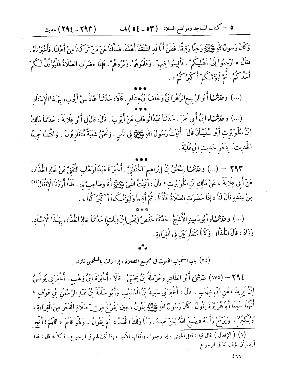 (٦٧٤) وَحَدَّثَنَا أَبُو الرَّبِيعِ الزَّهْرَانِيُّ، وَخَلَفُ بْنُ هِشَامٍ، قَالَا: حَدَّثَنَا حَمَّادٌ، عَنْ أَيُّوبَ، بِهَذَا الْإِسْنَادِ، وَحَدَّثَنَاهُ ابْنُ أَبِي عُمَرَ، حَدَّثَنَا عَبْدُ الْوَهَّابِ، عَنْ أَيُّوبَ، قَالَ: قَالَ لِي أَبُو قِلَابَةَ، حَدَّثَنَا مَالِكُ بْنُ الْحُوَيْرِثِ أَبُو سُلَيْمَانَ، قَالَ: أَتَيْتُ رَسُولَ اللهِ صَلَّى اللهُ عَلَيْهِ وَسَلَّمَ فِي نَاسٍ، وَنَحْنُ شَبَبَةٌ مُتَقَارِبُونَ، وَاقْتَصَّا جَمِيعًا الْحَدِيثَ بِنَحْوِ حَدِيثِ ابْنِ عُلَيَّةَ