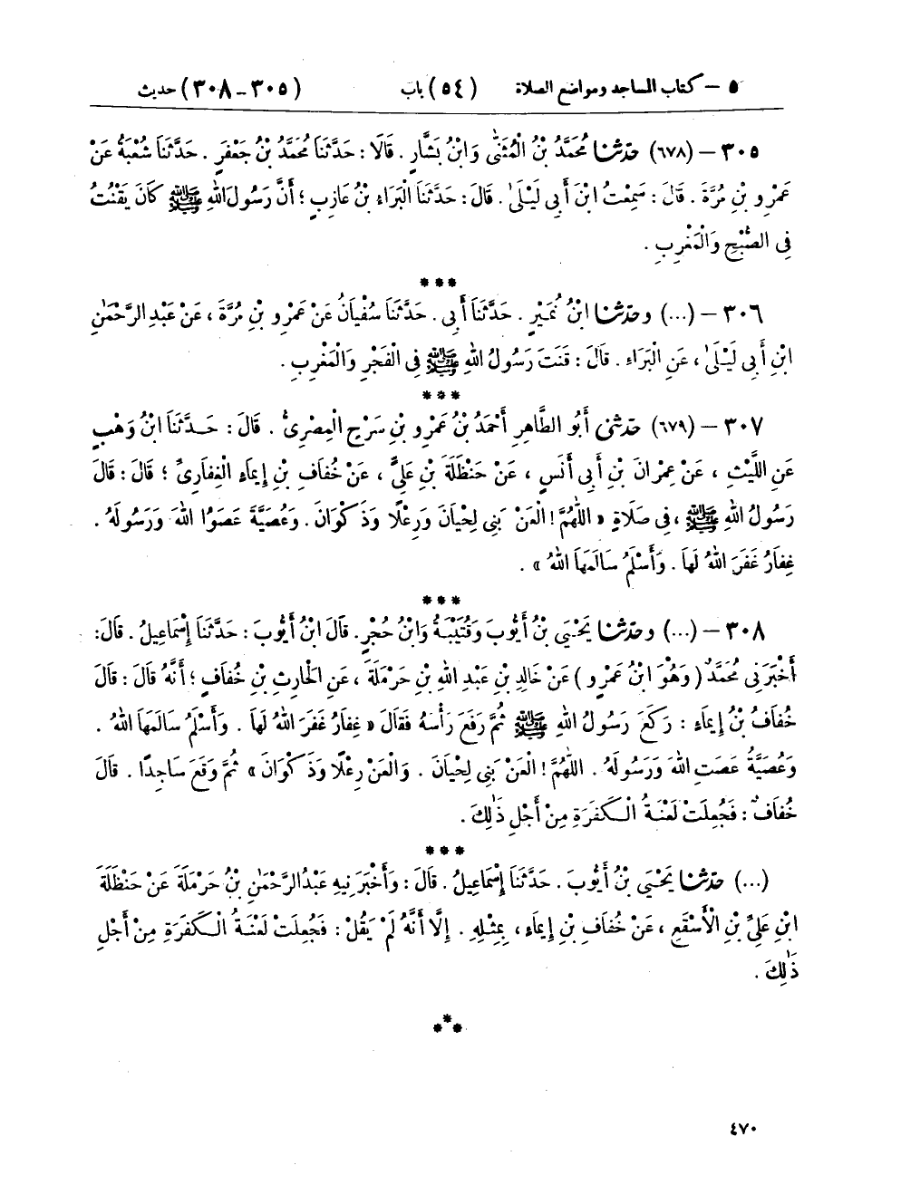 ٣٠٥ - (٦٧٨) حَدَّثَنَا مُحَمَّدُ بْنُ الْمُثَنَّى، وَابْنُ بَشَّارٍ، قَالَا: حَدَّثَنَا مُحَمَّدُ بْنُ جَعْفَرٍ، حَدَّثَنَا شُعْبَةُ، عَنْ عَمْرِو بْنِ مُرَّةَ، قَالَ: سَمِعْتُ ابْنَ أَبِي لَيْلَى، قَالَ: حَدَّثَنَا الْبَرَاءُ بْنُ عَازِبٍ: «أَنَّ رَسُولَ اللهِ صَلَّى اللهُ عَلَيْهِ وَسَلَّمَ كَانَ يَقْنُتُ فِي الصُّبْحِ، وَالْمَغْرِبِ»