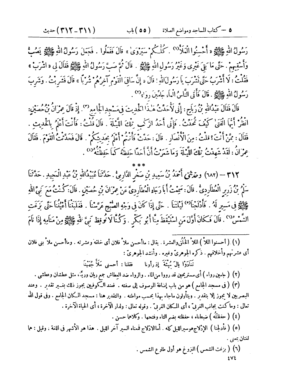 ٣١٢ - (٦٨٢) وَحَدَّثَنِي أَحْمَدُ بْنُ سَعِيدِ بْنِ صَخْرٍ الدَّارِمِيُّ، حَدَّثَنَا عُبَيْدُ اللهِ بْنُ عَبْدِ الْمَجِيدِ، حَدَّثَنَا سَلْمُ بْنُ زَرِيرٍ الْعُطَارِدِيُّ، قَالَ: سَمِعْتُ أَبَا رَجَاءٍ الْعُطَارِدِيَّ، عَنْ عِمْرَانَ بْنِ حُصَيْنٍ، قَالَ: كُنْتُ مَعَ نَبِيِّ اللهِ صَلَّى اللهُ عَلَيْهِ وَسَلَّمَ فِي مَسِيرٍ لَهُ، فَأَدْلَجْنَا لَيْلَتَنَا، حَتَّى إِذَا كَانَ فِي وَجْهِ الصُّبْحِ عَرَّسْنَا، فَغَلَبَتْنَا أَعْيُنُنَا حَتَّى بَزَغَتِ الشَّمْسُ، قَالَ: فَكَانَ أَوَّلَ مَنِ اسْتَيْقَظَ مِنَّا أَبُو بَكْرٍ، وَكُنَّا لَا نُوقِظُ نَبِيَّ اللهِ صَلَّى اللهُ عَلَيْهِ وَسَلَّمَ مَنْ مَنَامِهِ إِذَا نَامَ ⦗٤٧٥⦘ حَتَّى يَسْتَيْقِظَ، ثُمَّ اسْتَيْقَظَ عُمَرُ، فَقَامَ عِنْدَ نَبِيِّ اللهِ صَلَّى اللهُ عَلَيْهِ وَسَلَّمَ، فَجَعَلَ يُكَبِّرُ، وَيَرْفَعُ صَوْتَهُ بِالتَّكْبِيرِ حَتَّى اسْتَيْقَظَ رَسُولُ اللهِ صَلَّى اللهُ عَلَيْهِ وَسَلَّمَ، فَلَمَّا رَفَعَ رَأْسَهُ، وَرَأَى الشَّمْسَ قَدْ بَزَغَتْ، قَالَ: «ارْتَحِلُوا»، فَسَارَ بِنَا حَتَّى إِذَا ابْيَضَّتِ الشَّمْسُ نَزَلَ فَصَلَّى بِنَا الْغَدَاةَ، فَاعْتَزَلَ رَجُلٌ مِنَ الْقَوْمِ لَمْ يُصَلِّ مَعَنَا، فَلَمَّا انْصَرَفَ، قَالَ لَهُ رَسُولُ اللهِ صَلَّى اللهُ عَلَيْهِ وَسَلَّمَ: «يَا فُلَانُ مَا مَنَعَكَ أَنْ تُصَلِّيَ مَعَنَا؟» قَالَ: يَا نَبِيَّ اللهِ أَصَابَتْنِي جَنَابَةٌ، فَأَمَرَهُ رَسُولُ اللهِ صَلَّى اللهُ عَلَيْهِ وَسَلَّمَ فَتَيَمَّمَ بِالصَّعِيدِ، فَصَلَّى، ثُمَّ عَجَّلَنِي فِي رَكْبٍ بَيْنَ يَدَيْهِ نَطْلُبُ الْمَاءَ، وَقَدْ عَطِشْنَا عَطَشًا شَدِيدًا، فَبَيْنَمَا نَحْنُ نَسِيرُ إِذَا نَحْنُ بِامْرَأَةٍ سَادِلَةٍ رِجْلَيْهَا بَيْنَ مَزَادَتَيْنِ، فَقُلْنَا لَهَا: أَيْنَ الْمَاءُ؟ قَالَتْ: أَيْهَاهْ أَيْهَاهْ، لَا مَاءَ لَكُمْ، قُلْنَا: فَكَمْ بَيْنَ أَهْلِكِ وَبَيْنَ الْمَاءِ؟ قَالَتْ: مَسِيرَةُ يَوْمٍ وَلَيْلَةٍ، قُلْنَا: انْطَلِقِي إِلَى رَسُولِ اللهِ صَلَّى اللهُ عَلَيْهِ وَسَلَّمَ، قَالَتْ: وَمَا رَسُولُ اللهِ؟ فَلَمْ نُمَلِّكْهَا مِنْ أَمْرِهَا شَيْئًا حَتَّى انْطَلَقْنَا بِهَا، فَاسْتَقْبَلْنَا بِهَا رَسُولَ اللهِ صَلَّى اللهُ عَلَيْهِ وَسَلَّمَ، فَسَأَلَهَا، فَأَخْبَرَتْهُ مِثْلَ الَّذِي أَخْبَرَتْنَا، وَأَخْبَرَتْهُ أَنَّهَا مُوتِمَةٌ لَهَا صِبْيَانٌ أَيْتَامٌ، فَأَمَرَ بِرَاوِيَتِهَا فَأُنِيخَتْ فَمَجَّ فِي الْعَزْلَاوَيْنِ الْعُلْيَاوَيْنِ، ثُمَّ بَعَثَ بِرَاوِيَتِهَا، فَشَرِبْنَا وَنَحْنُ أَرْبَعُونَ رَجُلًا عِطَاشٌ حَتَّى رَوِينَا، وَمَلَأْنَا كُلَّ قِرْبَةٍ مَعَنَا وَإِدَاوَةٍ، وَغَسَّلْنَا صَاحِبَنَا، غَيْرَ أَنَّا لَمْ نَسْقِ بَعِيرًا، وَهِيَ تَكَادُ تَنْضَرِجُ مِنَ الْمَاءِ - يَعْنِي الْمَزَادَتَيْنِ - ثُمَّ قَالَ: «هَاتُوا مَا كَانَ عِنْدَكُمْ»، فَجَمَعْنَا لَهَا مِنْ كِسَرٍ وَتَمْرٍ، وَصَرَّ لَهَا صُرَّةً، فَقَالَ لَهَا: «اذْهَبِي فَأَطْعِمِي هَذَا عِيَالَكِ، وَاعْلَمِي أَنَّا لَمْ نَرْزَأْ مِنْ مَائِكِ»، فَلَمَّا أَتَتْ أَهْلَهَا قَالَتْ: لَقَدْ لَقِيتُ أَسْحَرَ الْبَشَرِ، أَوْ إِنَّهُ لَنَبِيٌّ كَمَا زَعَمَ، كَانَ مِنْ أَمْرِهِ ذَيْتَ وَذَيْتَ، فَهَدَى اللهُ ذَاكَ الصِّرْمَ بِتِلْكَ الْمَرْأَةِ، فَأَسْلَمَتْ وَأَسْلَمُوا