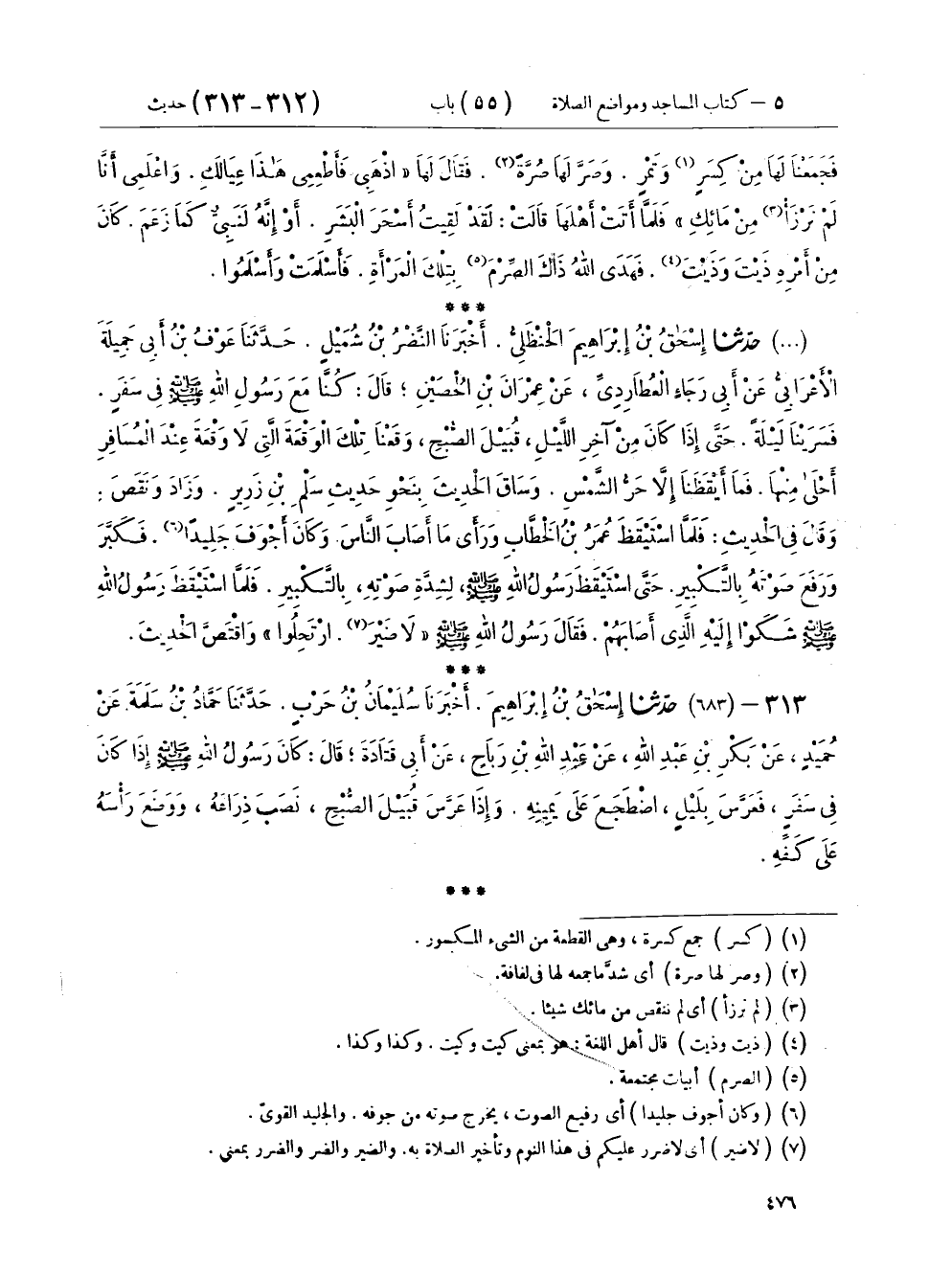 ٣١٣ - (٦٨٣) حَدَّثَنَا إِسْحَاقُ بْنُ إِبْرَاهِيمَ، أَخْبَرَنَا سُلَيْمَانُ بْنُ حَرْبٍ، حَدَّثَنَا حَمَّادُ بْنُ سَلَمَةَ، عَنْ حُمَيْدٍ، عَنْ بَكْرِ بْنِ عَبْدِ اللهِ، عَنْ عَبْدِ اللهِ بْنِ رَبَاحٍ، عَنْ أَبِي قَتَادَةَ، قَالَ: «كَانَ رَسُولُ اللهِ صَلَّى اللهُ عَلَيْهِ وَسَلَّمَ إِذَا كَانَ فِي سَفَرٍ فَعَرَّسَ بِلَيْلٍ، اضْطَجَعَ عَلَى يَمِينِهِ، وَإِذَا عَرَّسَ قُبَيْلَ الصُّبْحِ نَصَبَ ذِرَاعَهُ، وَوَضَعَ رَأْسَهُ عَلَى كَفِّهِ»