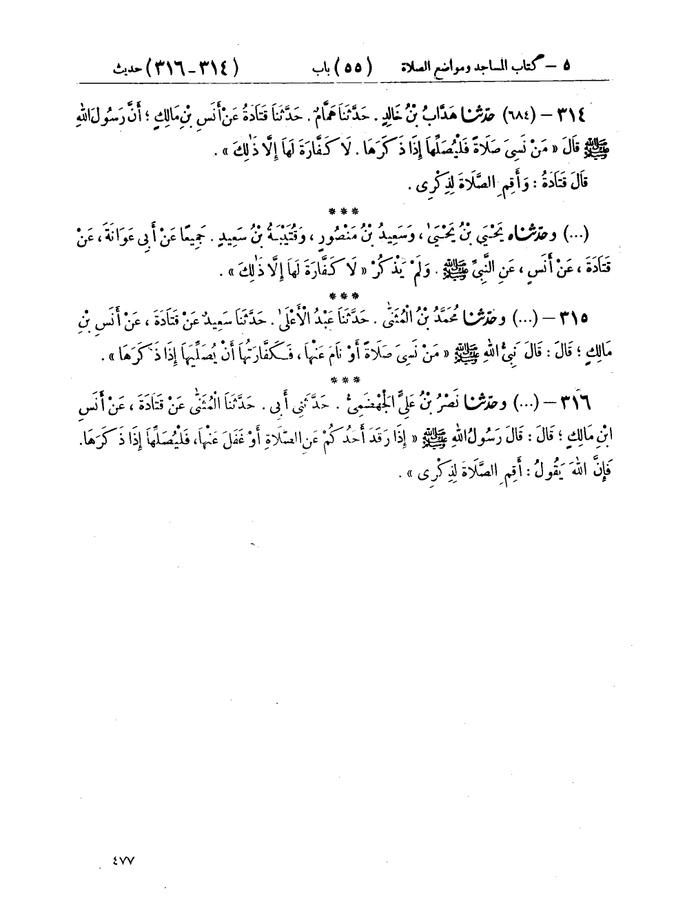 ٣١٥ - (٦٨٤) وَحَدَّثَنَا مُحَمَّدُ بْنُ الْمُثَنَّى، حَدَّثَنَا عَبْدُ الْأَعْلَى، حَدَّثَنَا سَعِيدٌ، عَنْ قَتَادَةَ، عَنْ أَنَسِ بْنِ مَالِكٍ، قَالَ: قَالَ نَبِيُّ اللهِ صَلَّى اللهُ عَلَيْهِ وَسَلَّمَ: «مَنْ نَسِيَ صَلَاةً، أَوْ نَامَ عَنْهَا، فَكَفَّارَتُهَا أَنْ يُصَلِّيَهَا إِذَا ذَكَرَهَا»