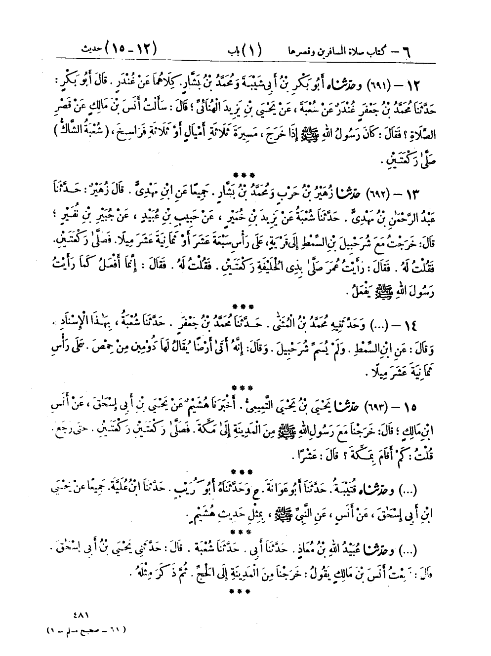 ١٣ - (٦٩٢) حَدَّثَنَا زُهَيْرُ بْنُ حَرْبٍ، وَمُحَمَّدُ بْنُ بَشَّارٍ، جَمِيعًا عَنِ ابْنِ مَهْدِيٍّ، قَالَ زُهَيْرٌ: حَدَّثَنَا عَبْدُ الرَّحْمَنِ بْنُ مَهْدِيٍّ، حَدَّثَنَا شُعْبَةُ، عَنْ يَزِيدَ بْنِ خُمَيْرٍ، عَنْ حَبِيبِ بْنِ عُبَيْدٍ، عَنْ جُبَيْرِ بْنِ نُفَيْرٍ، قَالَ: خَرَجْتُ مَعَ شُرَحْبِيلَ بْنِ السِّمْطِ إِلَى قَرْيَةٍ عَلَى رَأْسِ سَبْعَةَ عَشَرَ، أَوْ ثَمَانِيَةَ عَشَرَ مِيلًا، فَصَلَّى رَكْعَتَيْنِ، فَقُلْتُ لَهُ: فَقَالَ: رَأَيْتُ عُمَرَ صَلَّى بِذِي الْحُلَيْفَةِ رَكْعَتَيْنِ، فَقُلْتُ لَهُ: فَقَالَ: «إِنَّمَا أَفْعَلُ كَمَا رَأَيْتُ رَسُولَ اللهِ صَلَّى اللهُ عَلَيْهِ وَسَلَّمَ يَفْعَلُ»
