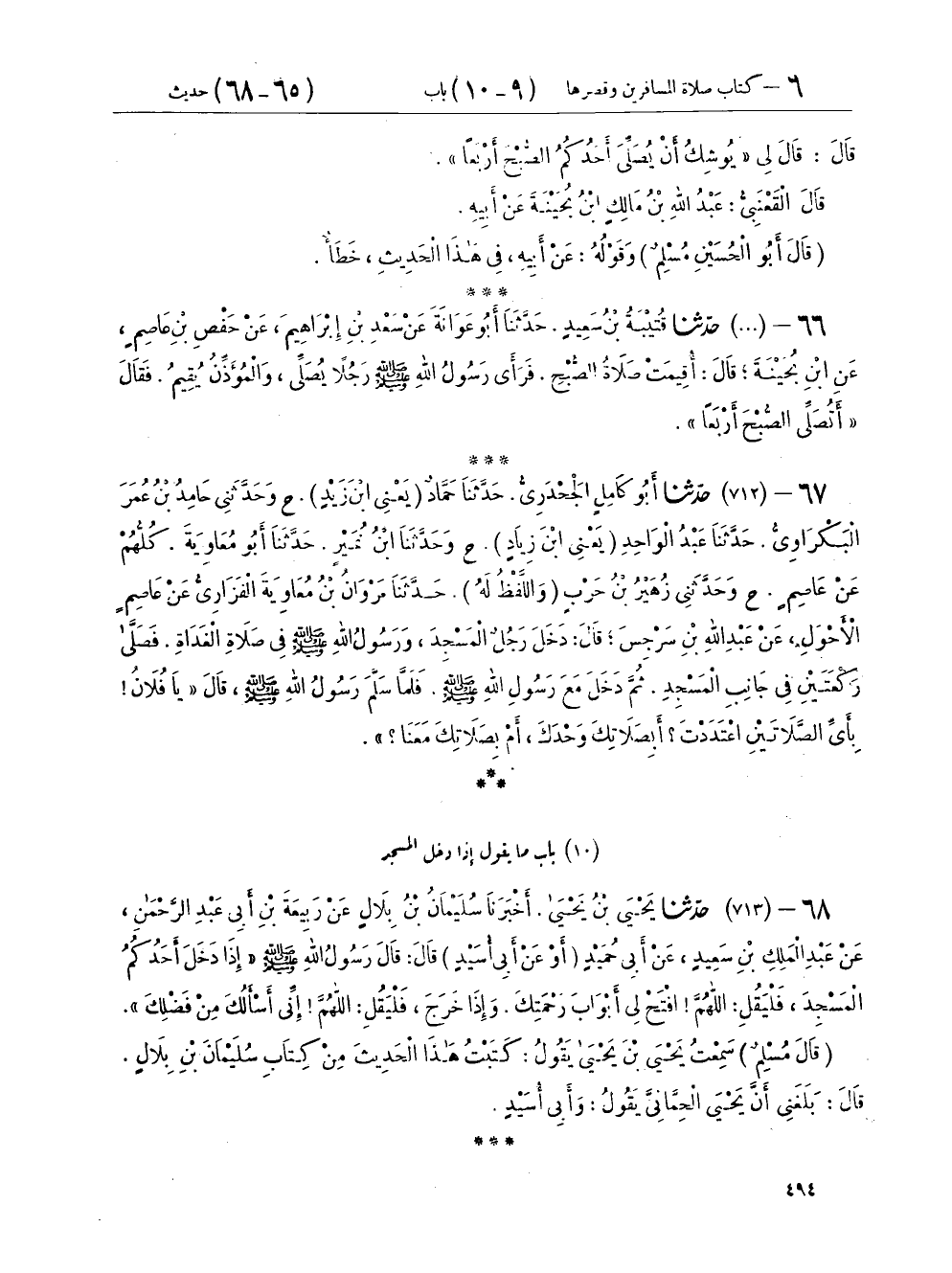 ٦٨ - (٧١٣) حَدَّثَنَا يَحْيَى بْنُ يَحْيَى، أَخْبَرَنَا سُلَيْمَانُ بْنُ بِلَالٍ، عَنْ رَبِيعَةَ بْنِ أَبِي عَبْدِ الرَّحْمَنِ، عَنْ عَبْدِ الْمَلِكِ بْنِ سَعِيدٍ، عَنْ أَبِي حُمَيْدٍ، أَو عَنْ أَبِي أُسَيْدٍ، قَالَ: قَالَ رَسُولُ اللهِ صَلَّى اللهُ عَلَيْهِ وَسَلَّمَ: " إِذَا دَخَلَ أَحَدُكُمُ الْمَسْجِدَ، فَلْيَقُلْ: اللهُمَّ افْتَحْ لِي أَبْوَابَ رَحْمَتِكَ، وَإِذَا خَرَجَ، فَلْيَقُلْ: اللهُمَّ إِنِّي أَسْأَلُكَ مِنْ فَضْلِكَ ". قَالَ مُسْلِمٌ: " سَمِعْتُ يَحْيَى بْنَ يَحْيَى، يَقُولُ: كَتَبْتُ هَذَا الْحَدِيثَ مِنْ كِتَابِ سُلَيْمَانَ بْنِ بِلَالٍ، قَالَ: بَلَغَنِي أَنَّ يَحْيَى الْحِمَّانِيَّ، يَقُولُ: وَأَبِي أُسَيْدٍ ".
