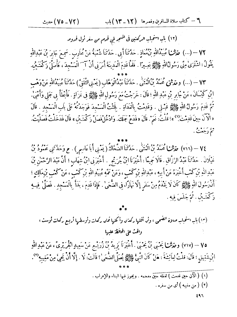 ٧٤ - (٧١٦) حَدَّثَنَا مُحَمَّدُ بْنُ الْمُثَنَّى، حَدَّثَنَا الضَّحَّاكُ يَعْنِي أَبَا عَاصِمٍ، ح وحَدَّثَنِي مَحْمُودُ بْنُ غَيْلَانَ، حَدَّثَنَا عَبْدُ الرَّزَّاقِ، قَالَا جَمِيعًا: أَخْبَرَنَا ابْنُ جُرَيْجٍ، أَخْبَرَنِي ابْنُ شِهَابٍ، أَنَّ عَبْدَ الرَّحْمَنِ بْنَ عَبْدِ اللهِ بْنِ كَعْبٍ، أَخْبَرَهُ عَنْ أَبِيهِ عَبْدِ اللهِ بْنِ كَعْبٍ، وَعَنْ عَمِّهِ عُبَيْدِ اللهِ بْنِ كَعْبٍ، عَنْ كَعْبِ بْنِ مَالِكٍ، أَنَّ رَسُولَ اللهِ صَلَّى اللهُ عَلَيْهِ وَسَلَّمَ «كَانَ لَا يَقْدَمُ مِنْ سَفَرٍ إِلَّا نَهَارًا فِي الضُّحَى، فَإِذَا قَدِمَ بَدَأَ بِالْمَسْجِدِ، فَصَلَّى فِيهِ رَكْعَتَيْنِ، ثُمَّ جَلَسَ فِيهِ»