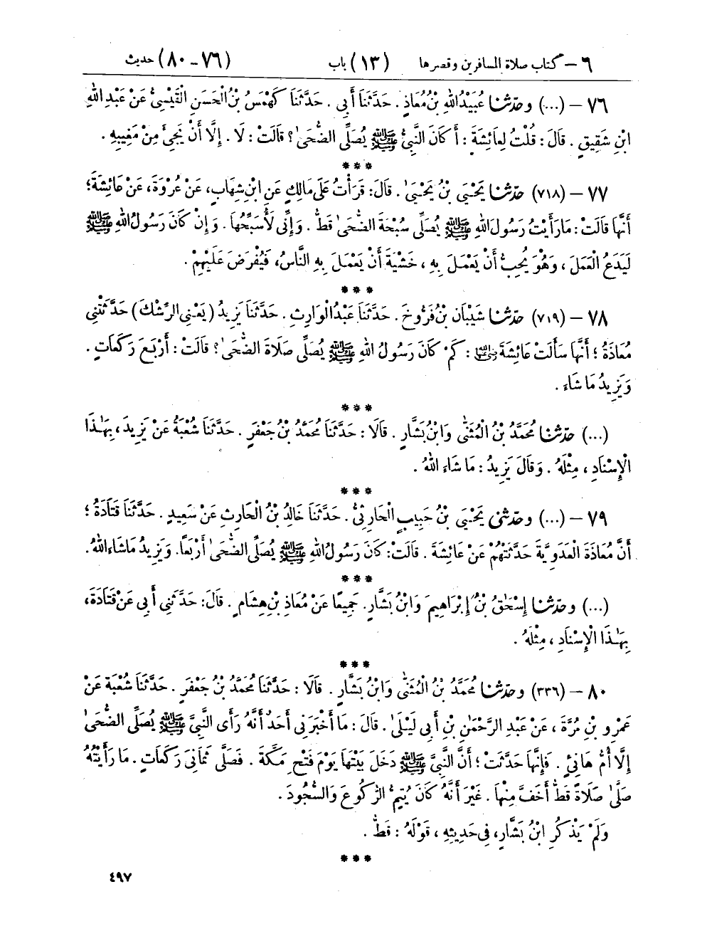 ٧٩ - (٧١٩) وحَدَّثَنِي يَحْيَى بْنُ حَبِيبٍ الْحَارِثِيُّ، حَدَّثَنَا خَالِدُ بْنُ الْحَارِثِ، عَنْ سَعِيدٍ، حَدَّثَنَا قَتَادَةُ، أَنَّ مُعَاذَةَ الْعَدَوِيَّةَ، حَدَّثَتْهُمْ عَنْ عَائِشَةَ، قَالَتْ: «كَانَ رَسُولُ اللهِ صَلَّى اللهُ عَلَيْهِ وَسَلَّمَ يُصَلِّي الضُّحَى أَرْبَعًا، وَيَزِيدُ مَا شَاءَ اللهُ».