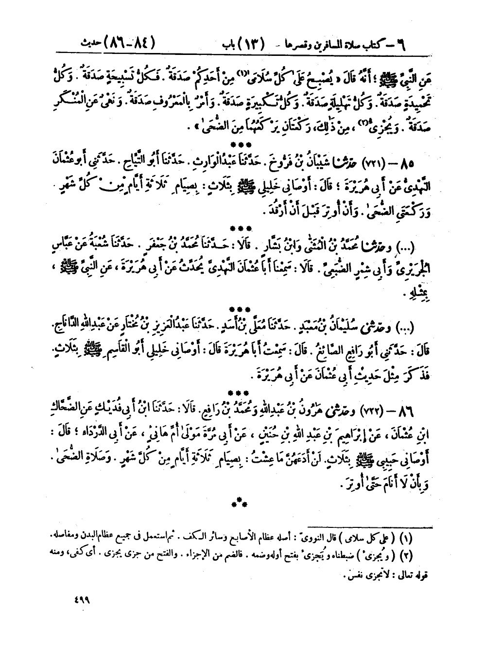 ٨٦ - (٧٢٢) وحَدَّثَنِي هَارُونُ بْنُ عَبْدِ اللهِ، وَمُحَمَّدُ بْنُ رَافِعٍ، قَالَا: حَدَّثَنَا ابْنُ أَبِي فُدَيْكٍ، عَنِ الضَّحَّاكِ بْنِ عُثْمَانَ، عَنْ إِبْرَاهِيمَ بْنِ عَبْدِ اللهِ بْنِ حُنَيْنٍ، عَنْ أَبِي مُرَّةَ، مَوْلَى أُمِّ هَانِئٍ، عَنْ أَبِي الدَّرْدَاءِ، قَالَ: أَوْصَانِي حَبِيبِي صَلَّى اللهُ عَلَيْهِ وَسَلَّمَ بِثَلَاثٍ، لَنْ أَدَعَهُنَّ مَا عِشْتُ: «بِصِيَامِ ثَلَاثَةِ أَيَّامٍ مِنْ كُلِّ شَهْرٍ، وَصَلَاةِ الضُّحَى، وَبِأَنْ لَا أَنَامَ حَتَّى أُوتِرَ»