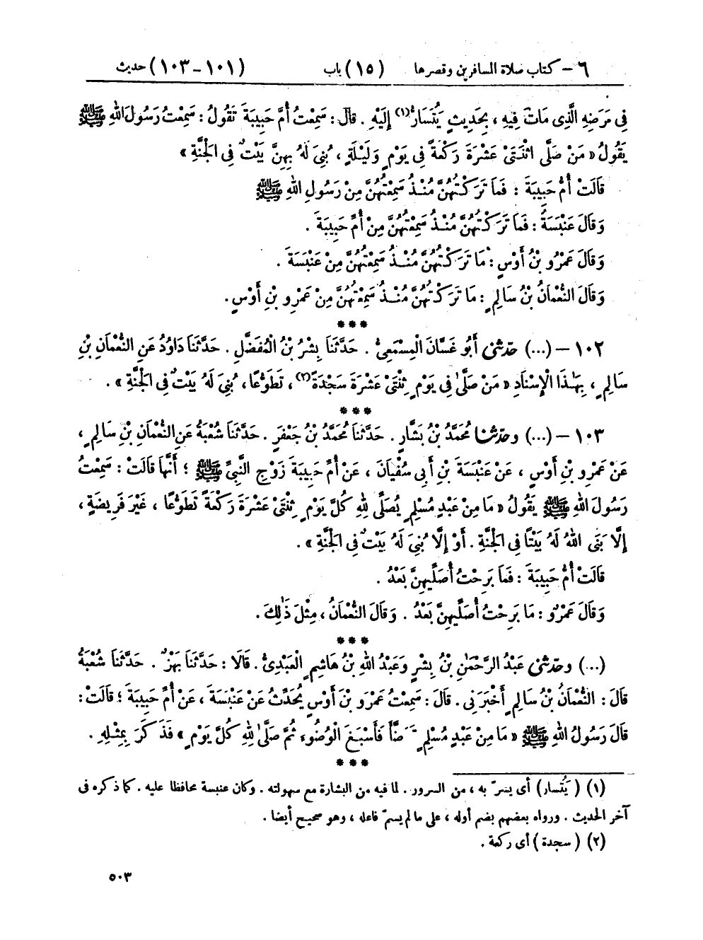 ١٠٣ - (٧٢٨) وحَدَّثَنَا مُحَمَّدُ بْنُ بَشَّارٍ، حَدَّثَنَا مُحَمَّدُ بْنُ جَعْفَرٍ، حَدَّثَنَا شُعْبَةُ، عَنِ النُّعْمَانِ بْنِ سَالِمٍ، عَنْ عَمْرِو بْنِ أَوْسٍ، عَنْ عَنْبَسَةَ بْنِ أَبِي سُفْيَانَ، عَنْ أُمِّ حَبِيبَةَ، زَوْجِ النَّبِيِّ صَلَّى اللهُ عَلَيْهِ وَسَلَّمَ، أَنَّهَا قَالَتْ: سَمِعْتُ رَسُولَ اللهِ صَلَّى اللهُ عَلَيْهِ وَسَلَّمَ، يَقُولُ: «مَا مِنْ عَبْدٍ مُسْلِمٍ يُصَلِّي لِلَّهِ كُلَّ يَوْمٍ ثِنْتَيْ عَشْرَةَ رَكْعَةً تَطَوُّعًا، غَيْرَ فَرِيضَةٍ، إِلَّا بَنَى اللهُ لَهُ بَيْتًا فِي الْجَنَّةِ، أَوْ إِلَّا بُنِيَ لَهُ بَيْتٌ فِي الْجَنَّةِ» قَالَتْ أَمُّ حَبِيبَةَ: «فَمَا بَرِحْتُ أُصَلِّيهِنَّ بَعْدُ» وقَالَ عَمْرٌو: «مَا بَرِحْتُ أُصَلِّيهِنَّ بَعْدُ»، وقَالَ النُّعْمَانُ مِثْلَ ذَلِكَ.