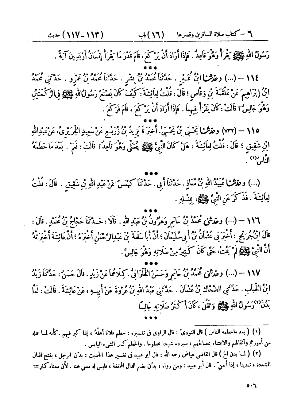 ١١٧ - (٧٣٢) وحَدَّثَنِي مُحَمَّدُ بْنُ حَاتِمٍ، وَحَسَنٌ الْحُلْوَانِيُّ، كِلَاهُمَا عَنْ زَيْدٍ، قَالَ حَسَنٌ: حَدَّثَنَا زَيْدُ بْنُ الْحُبَابِ، حَدَّثَنِي الضَّحَّاكُ بْنُ عُثْمَانَ، حَدَّثَنِي عَبْدُ اللهِ بْنُ عُرْوَةَ، عَنْ أَبِيهِ، عَنْ عَائِشَةَ، قَالَتْ: «لَمَّا بَدَّنَ رَسُولُ اللهِ صَلَّى اللهُ عَلَيْهِ وَسَلَّمَ، وَثَقُلَ، كَانَ أَكْثَرُ صَلَاتِهِ جَالِسًا»