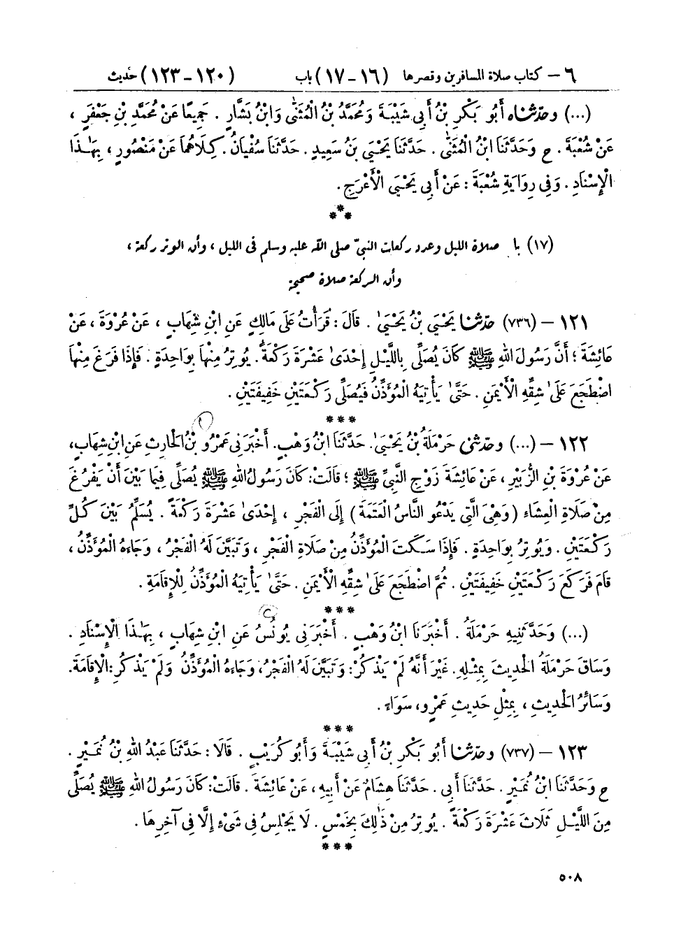 ١٢٣ - (٧٣٧) وحَدَّثَنَا أَبُو بَكْرِ بْنُ أَبِي شَيْبَةَ، وَأَبُو كُرَيْبٍ، قَالَا: حَدَّثَنَا عَبْدُ اللهِ بْنُ نُمَيْرٍ، ح وحَدَّثَنَا ابْنُ نُمَيْرٍ، حَدَّثَنَا أَبِي، حَدَّثَنَا هِشَامٌ، عَنْ أَبِيهِ، عَنْ عَائِشَةَ، قَالَتْ: «كَانَ رَسُولُ اللهِ صَلَّى اللهُ عَلَيْهِ وَسَلَّمَ يُصَلِّي مِنَ اللَّيْلِ ثَلَاثَ عَشْرَةَ رَكْعَةً، يُوتِرُ مِنْ ذَلِكَ بِخَمْسٍ، لَا يَجْلِسُ فِي شَيْءٍ إِلَّا فِي آخِرِهَا».