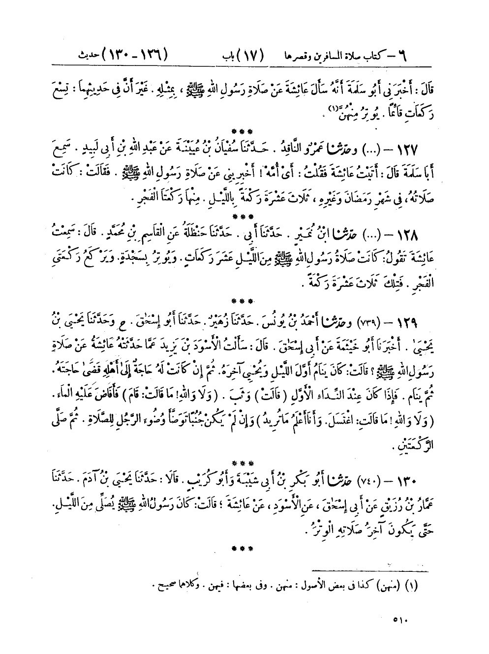 ١٣٠ - (٧٤٠) حَدَّثَنَا أَبُو بَكْرِ بْنُ أَبِي شَيْبَةَ، وَأَبُو كُرَيْبٍ، قَالَا: حَدَّثَنَا يَحْيَى بْنُ آدَمَ، حَدَّثَنَا عَمَّارُ بْنُ رُزَيْقٍ، عَنْ أَبِي إِسْحَاقَ، عَنِ الْأَسْوَدِ، عَنْ عَائِشَةَ، قَالَتْ: «كَانَ رَسُولُ اللهِ صَلَّى اللهُ عَلَيْهِ وَسَلَّمَ يُصَلِّي مِنَ اللَّيْلِ حَتَّى يَكُونَ آخِرَ صَلَاتِهِ الْوِتْرُ»