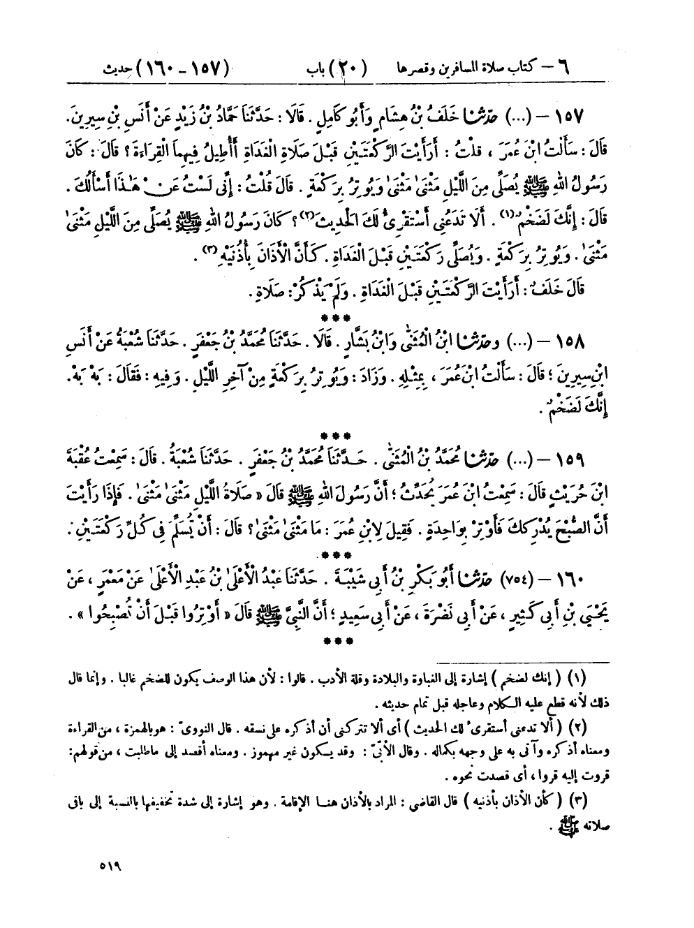 ١٥٧ - (٧٤٩) حَدَّثَنَا خَلَفُ بْنُ هِشَامٍ، وَأَبُو كَامِلٍ، قَالَا: حَدَّثَنَا حَمَّادُ بْنُ زَيْدٍ، عَنْ أَنَسِ بْنِ سِيرِينَ، قَالَ: سَأَلْتُ ابْنَ عُمَرَ، قُلْتُ: أَرَأَيْتَ الرَّكْعَتَيْنِ قَبْلَ صَلَاةِ الْغَدَاةِ، أَأُطِيلُ فِيهِمَا الْقِرَاءَةَ؟ قَالَ: «كَانَ رَسُولُ اللهِ صَلَّى اللهُ عَلَيْهِ وَسَلَّمَ يُصَلِّي مِنَ اللَّيْلِ مَثْنَى مَثْنَى، وَيُوتِرُ بِرَكْعَةٍ»، قَالَ: قُلْتُ: إِنِّي لَسْتُ عَنْ هَذَا أَسْأَلُكَ، قَالَ: إِنَّكَ لَضَخْمٌ، أَلَا تَدَعُنِي أَسْتَقْرِئُ لَكَ الْحَدِيثَ، «كَانَ رَسُولُ اللهِ صَلَّى اللهُ عَلَيْهِ وَسَلَّمَ يُصَلِّي مِنَ اللَّيْلِ مَثْنَى مَثْنَى، وَيُوتِرُ بِرَكْعَةٍ، وَيُصَلِّي رَكْعَتَيْنِ قَبْلَ الْغَدَاةِ كَأَنَّ الْأَذَانَ بِأُذُنَيْهِ». قَالَ خَلَفٌ: أَرَأَيْتَ الرَّكْعَتَيْنِ قَبْلَ الْغَدَاةِ، وَلَمْ يَذْكُرْ صَلَاةِ.