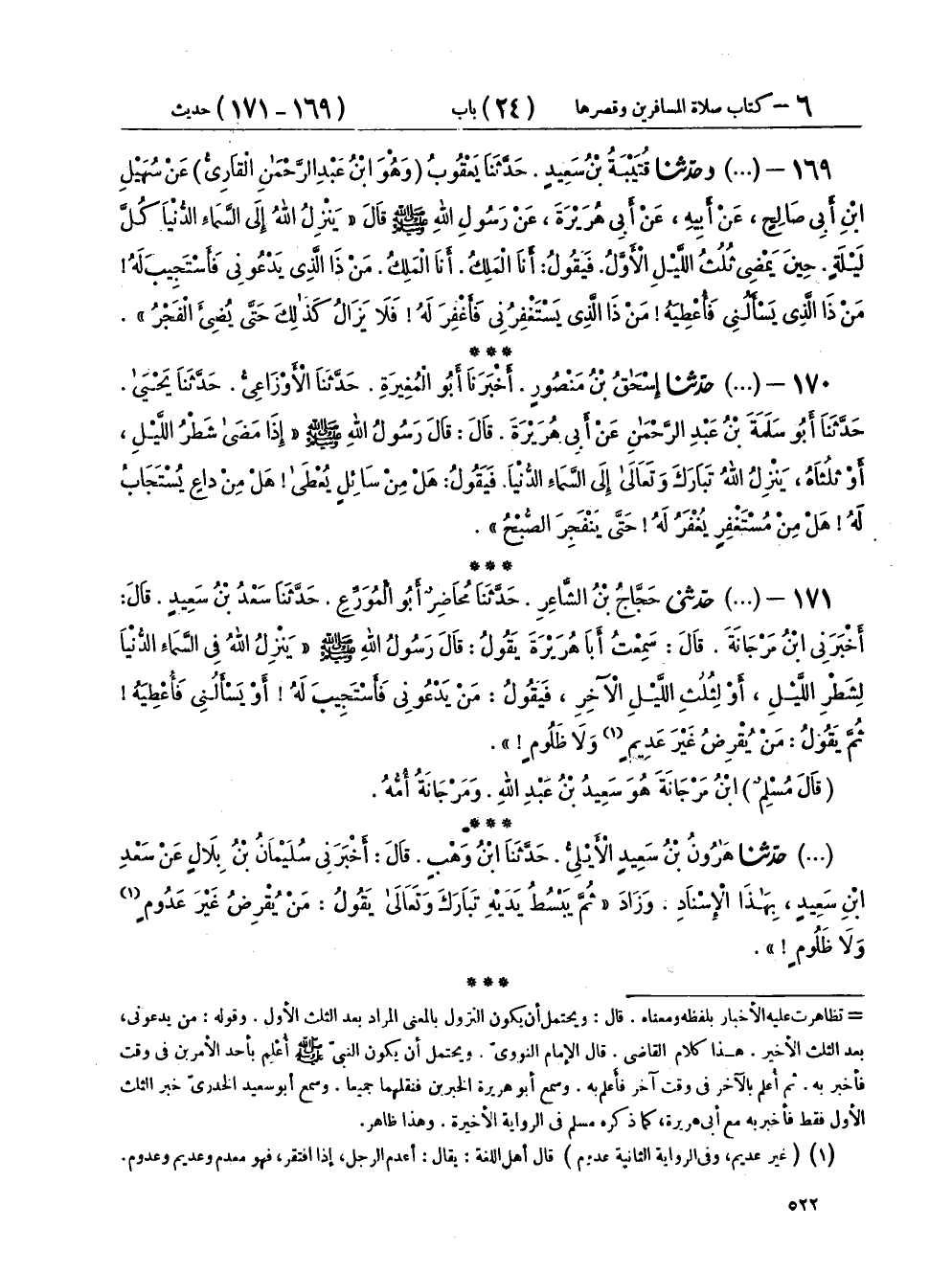 ١٧١ - (٧٥٨) حَدَّثَنِي حَجَّاجُ بْنُ الشَّاعِرِ، حَدَّثَنَا مُحَاضِرٌ أَبُو الْمُوَرِّعِ، حَدَّثَنَا سَعْدُ بْنُ سَعِيدٍ، قَالَ: أَخْبَرَنِي ابْنُ مَرْجَانَةَ، قَالَ: سَمِعْتُ أَبَا هُرَيْرَةَ، يَقُولُ: قَالَ رَسُولُ اللهِ صَلَّى اللهُ عَلَيْهِ وَسَلَّمَ: " يَنْزِلُ اللهُ فِي السَّمَاءِ الدُّنْيَا لِشَطْرِ اللَّيْلِ، أَوْ لِثُلُثِ اللَّيْلِ الْآخِرِ، فَيَقُولُ: مَنْ يَدْعُونِي فَأَسْتَجِيبَ لَهُ، أَوْ يَسْأَلُنِي فَأُعْطِيَهُ، ثُمَّ يَقُولُ: مَنْ يُقْرِضُ غَيْرَ عَدِيمٍ، وَلَا ظَلُومٍ ". قَالَ مُسْلِمٌ: «ابْنُ مَرْجَانَةَ هُو سَعِيدُ بْنُ عَبْدِ اللهِ، وَمَرْجَانَةُ أُمُّهُ». حَدَّثَنَا هَارُونُ بْنُ سَعِيدٍ الْأَيْلِيُّ، حَدَّثَنَا ابْنُ وَهْبٍ، قَالَ: أَخْبَرَنِي سُلَيْمَانُ بْنُ بِلَالٍ، عَنْ سَعْدِ بْنِ سَعِيدٍ بِهَذَا الْإِسْنَادِ، وَزَادَ، ثُمَّ يَبْسُطُ يَدَيْهِ تَبَارَكَ وَتَعَالَى، يَقُولُ: «مَنْ يُقْرِضُ غَيْرَ عَدُومٍ، وَلَا ظَلُومٍ»